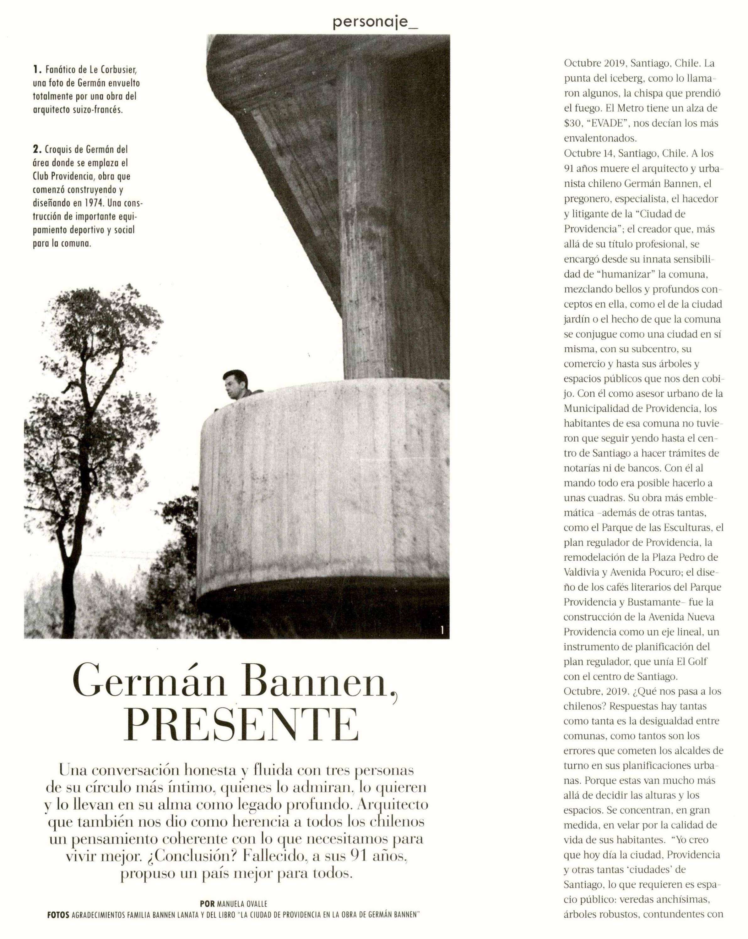 MásDeco de La Tercera publica artículo sobre la obra y el pensamiento del arquitecto y urbanista chileno Germán Bannen. Hablan los académicos Roberto Moris y Pedro Bannen, arquitecto, hijo mayor de Germán Bannen y autor del libro La ciudad de Providencia en la obra de Germán Bannen”.