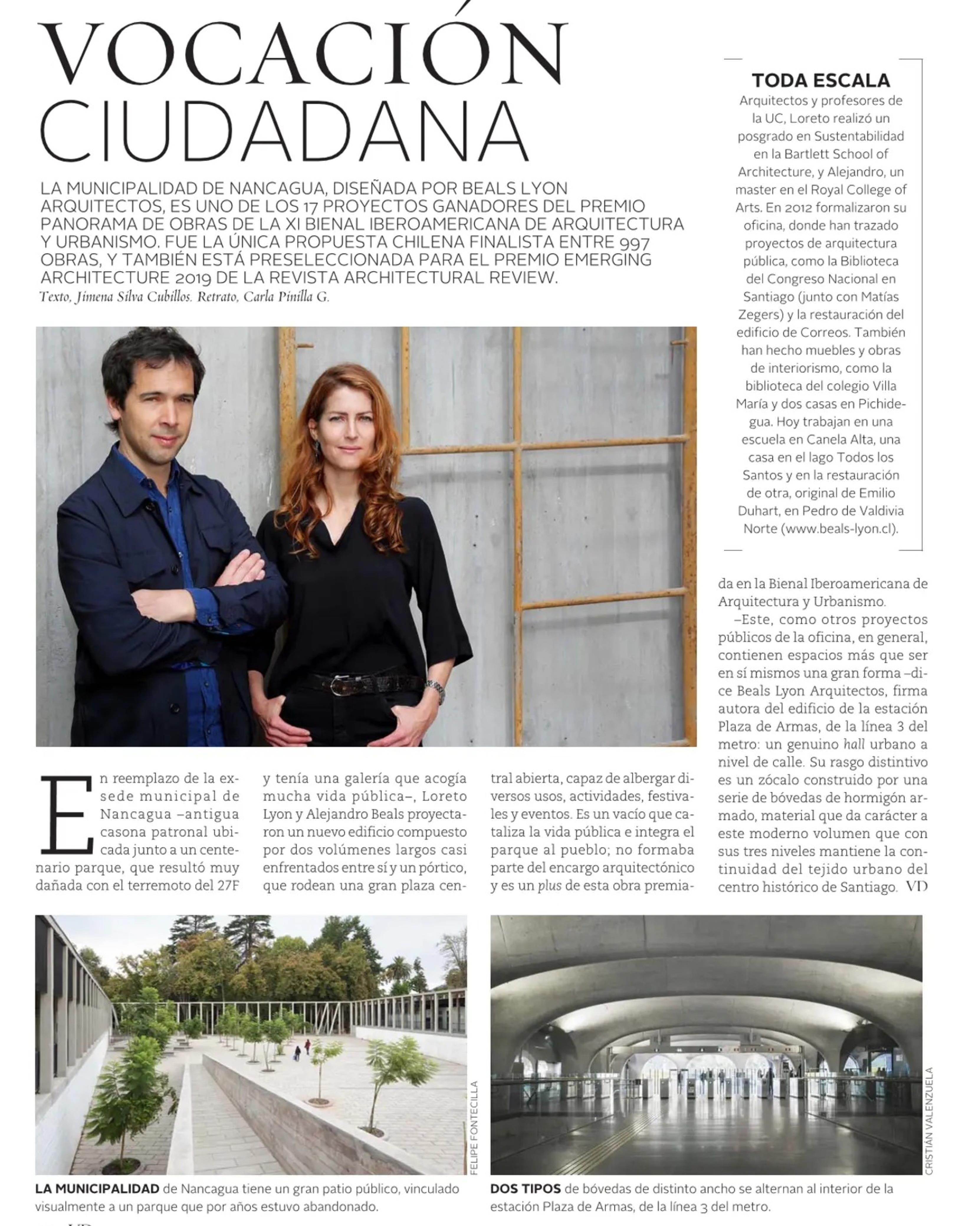 Revista VD de El Mercurio destaca que la sede municipal de Nancagua, diseñada por los arquitectos Loreto Lyon y Alejandro Beals, ambos académicos de la Escuela de Arquitectura, fue premiada en la Bienal Iberoamericana de Arquitectura y Urbanismo.