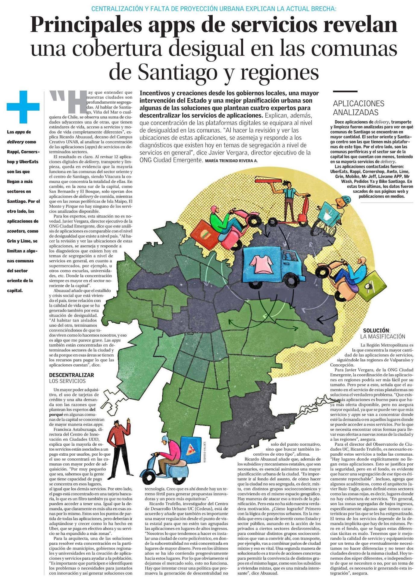 El Mercurio-Innovación destaca que las principales apps de servicios revelan una cobertura desigual en las comunas de Santiago y regiones. Habla Ricardo Trufello, investigador del centro y director del Observatorio de Ciudades UC.