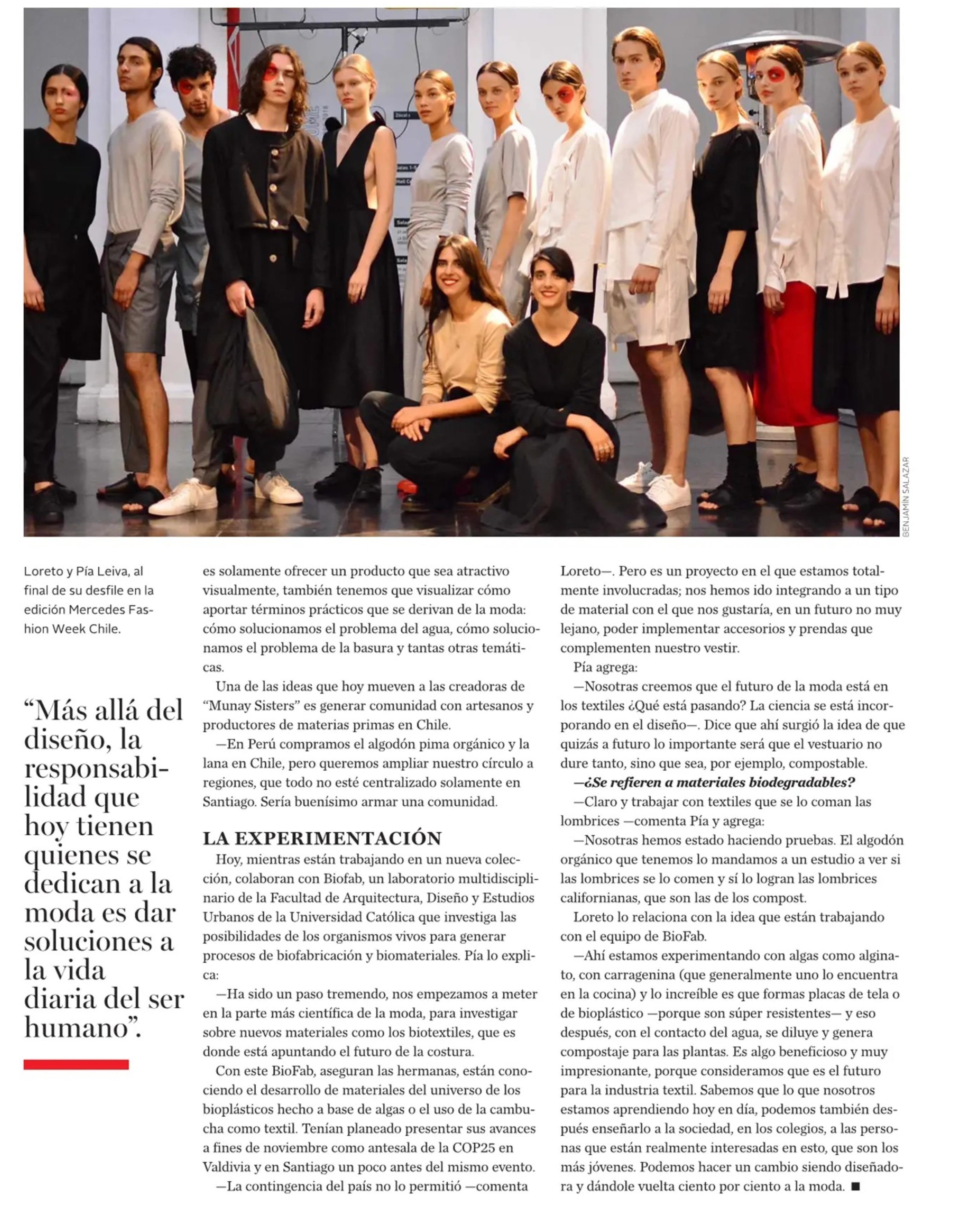 Revista Ya de El Mercurio entrevista a las hermanas Loreto y Pía Leiva sobre su proyecto de diseño de vestuario sustentable. Se destaca su colaboración con Biofab, un laboratorio multidisciplinario de la Facultad que investiga las posibilidades de los organismos vivos para generar procesos de biofabricación y biomateriales.