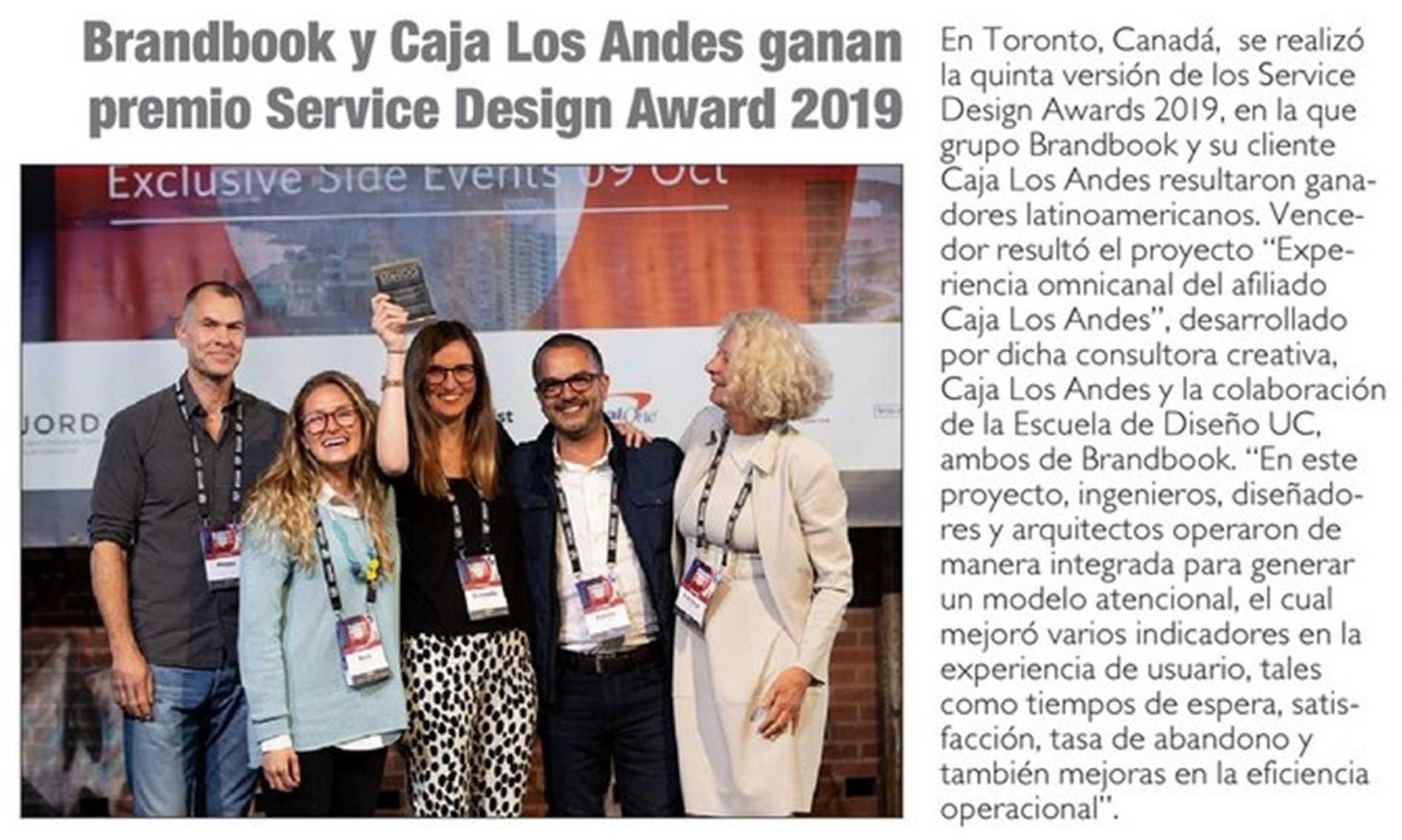 Premio Service Design Award 2019 Detalles 02 Diciembre 2019 Visto: 498 Tweet Las Últimas Noticias destaca que proyecto desarrollado por Brandbook, Caja Los Andes, con la colaboración de la Escuela Diseño, ganan premio Service Design Award 2019. + Revisa nota completa aquí.