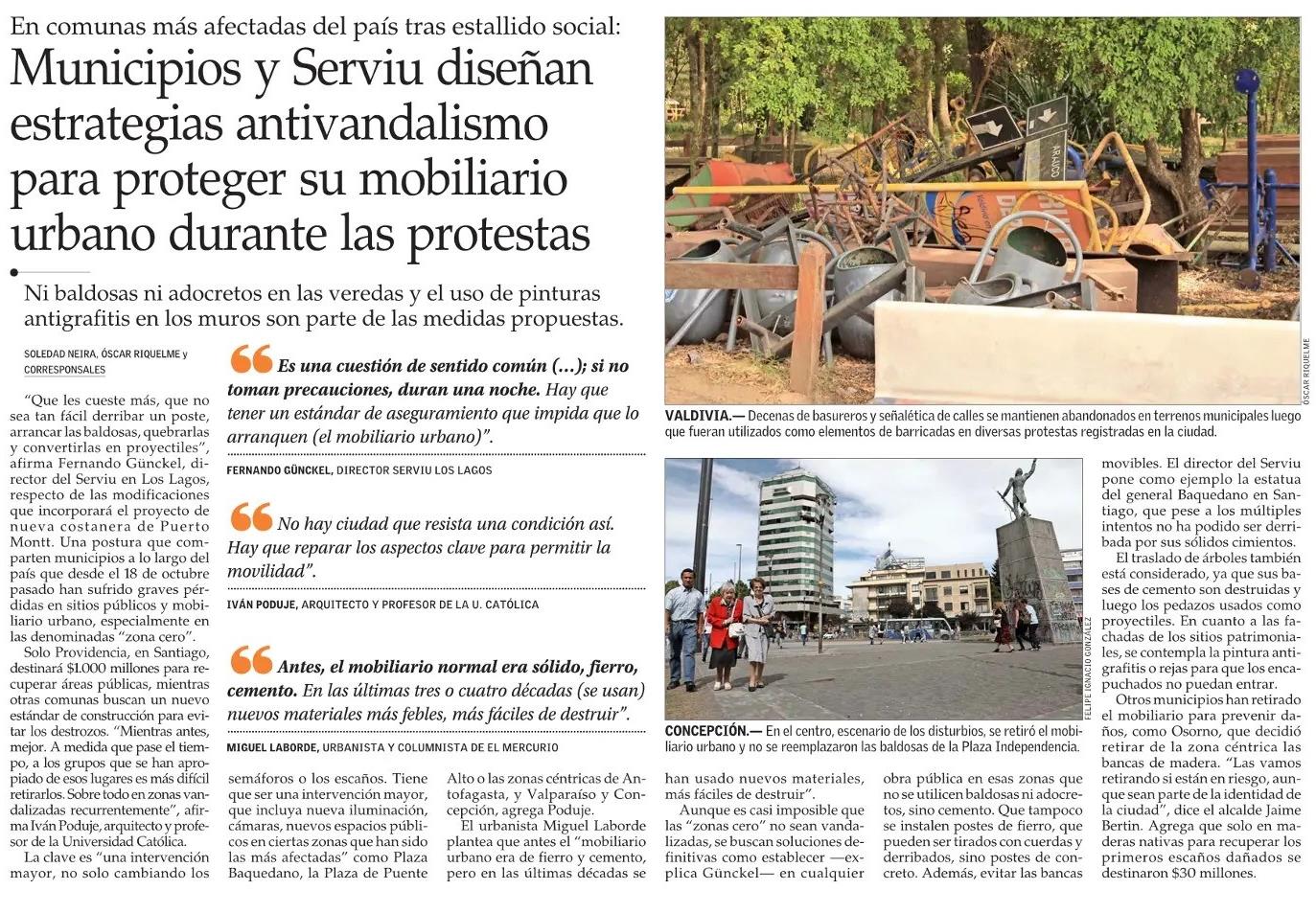Municipios y Serviu diseñan estrategias antivandalismo para proteger su mobiliario urbano durante las protestas Detalles 13 Marzo 2020 Visto: 628 Tweet El Mercurio destaca que municipios y Serviu diseñan estrategias antivandalismo para proteger su mobiliario urbano. Habla el profesor de la Escuela de Arquitectura, lván Poduje. + Revisa nota completa aquí.