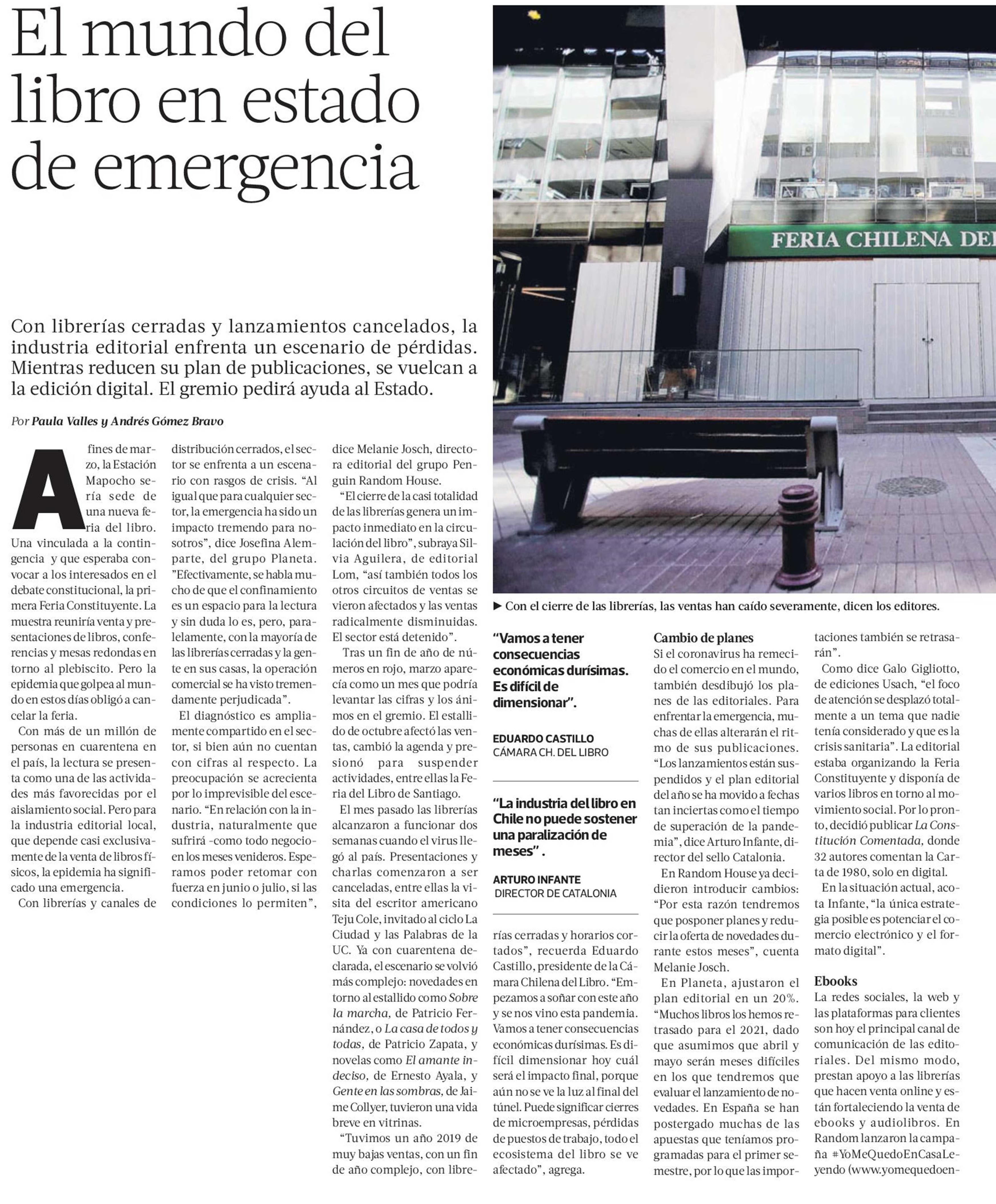 La Tercera destaca que con librerías cerradas y lanzamientos cancelados, la industria editorial enfrenta un escenario de pérdidas. Mientras reducen su plan de publicaciones, se vuelcan a la edición digital. Se menciona la suspensión de la visita del escritor americano Teju Cole, invitado al ciclo La Ciudad y las Palabras de la UC.