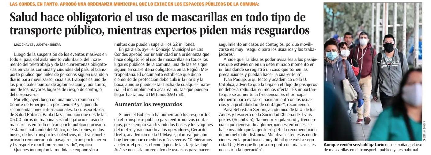 El Mercurio destaca que el Ministerio de Salud hace obligatorio el uso de mascarillas en todo tipo de transporte público, mientras expertos piden más resguardos. Habla el profesor de la Escuela de Arquitectura, Iván Poduje.