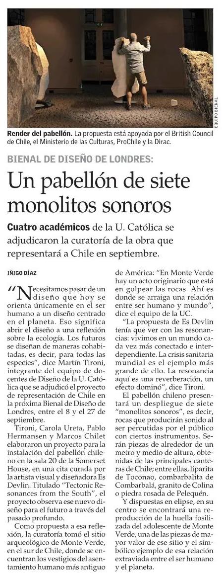 El Mercurio destaca que cuatro académicos de la UC se adjudicaron la curatoría de la obra que representará a Chile en la próxima Bienal de Diseño de Londres, entre el 8 y el 27 de septiembre. Habla Martín Tironi, integrante del equipo de docentes junto a Carola Ureta, Pablo Hermansen y Marcos Chilet.