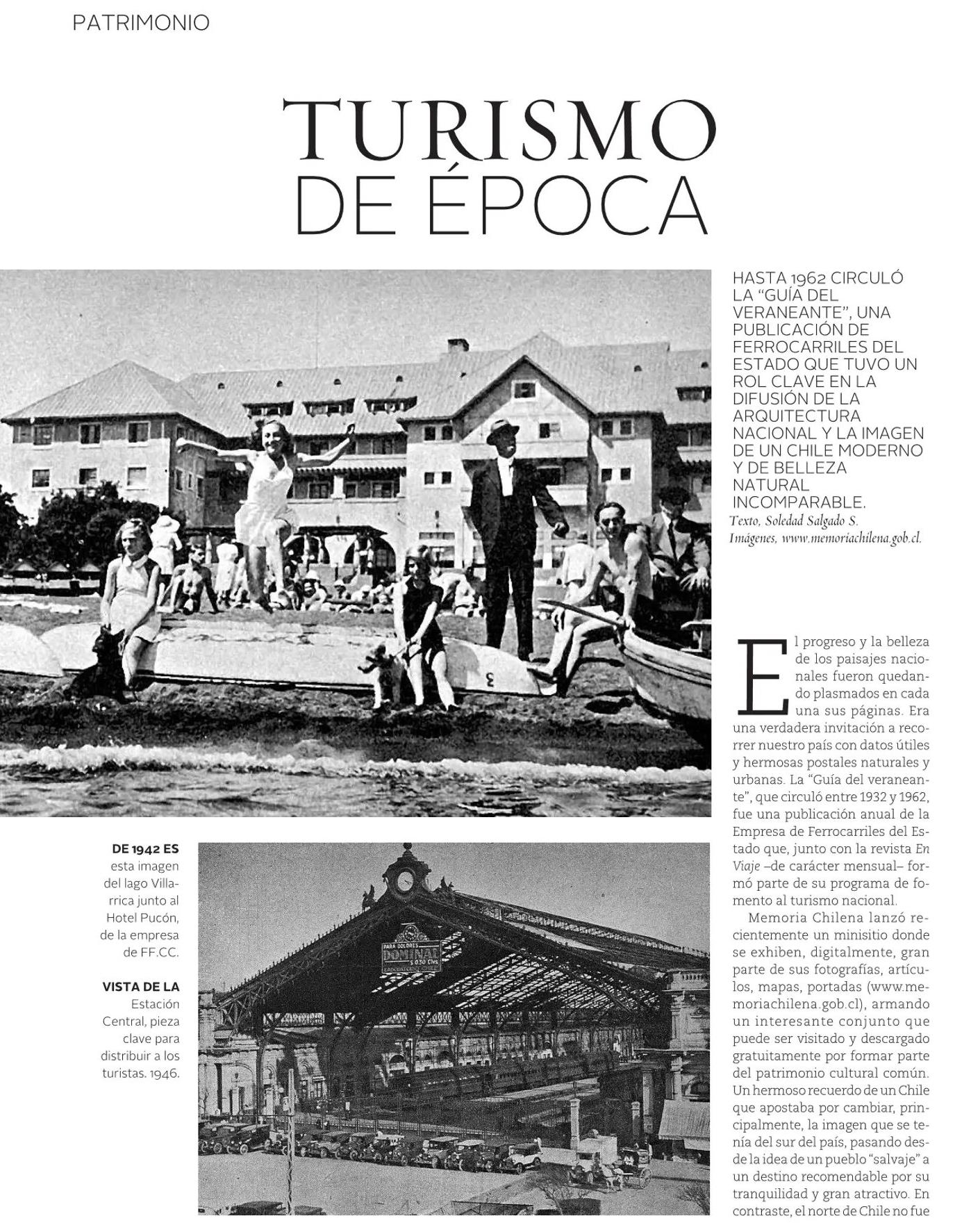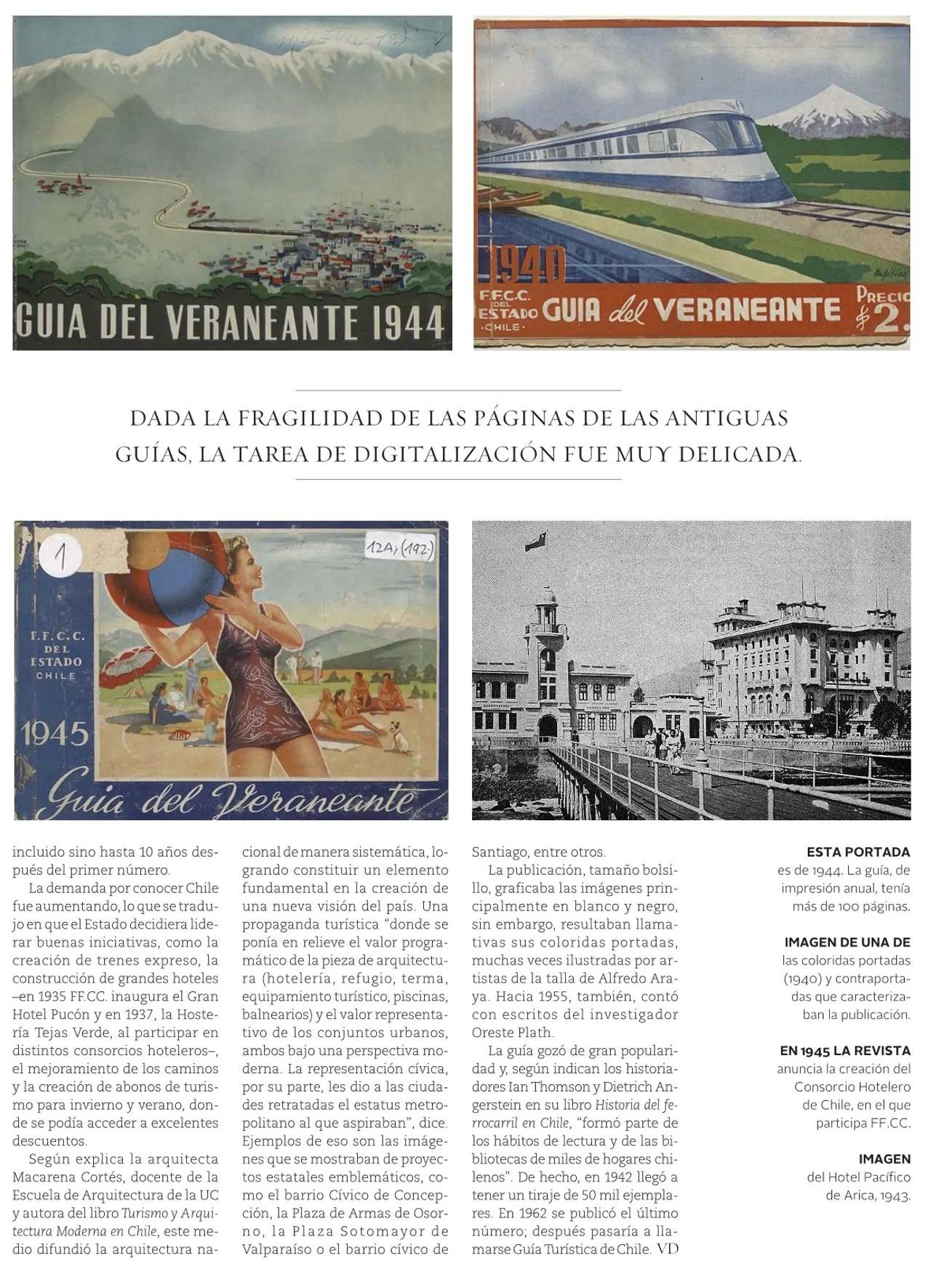 Revista VD de El Mercurio destaca que la Guía del veraneante, que circuló entre 1932 y 1962, fue una publicación anual de la Empresa de Ferrocarriles del Estado que, junto con la revista En Viaje, formó parte de su programa de fomento al turismo nacional. Memoria Chilena lanzó recientemente un minisitio donde se exhiben, digitalmente, gran parte de sus fotografías, artículos, mapas y portadas. Habla la profesora de la Escuela de Arquitectura Macarena Cortés, autora del libro Turismo y Arquitectura Moderna en Chile.