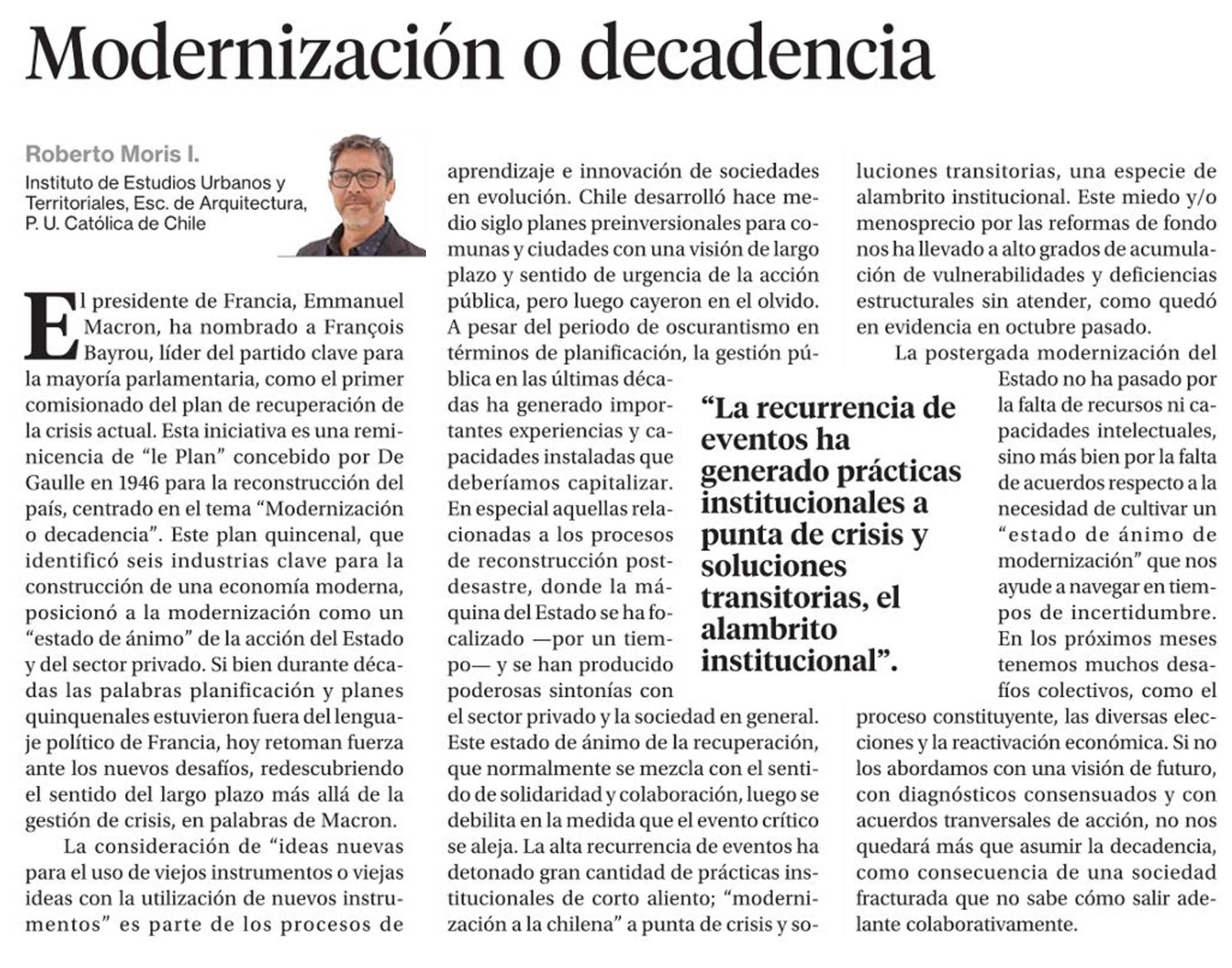 Modernización o decadencia Detalles 11 Septiembre 2020 Visto: 648 Tweet La Segunda publica columna del académico del Instituto de Estudios Urbanos, Roberto Moris: "Modernización o decadencia". + Revisa columna completa aquí.