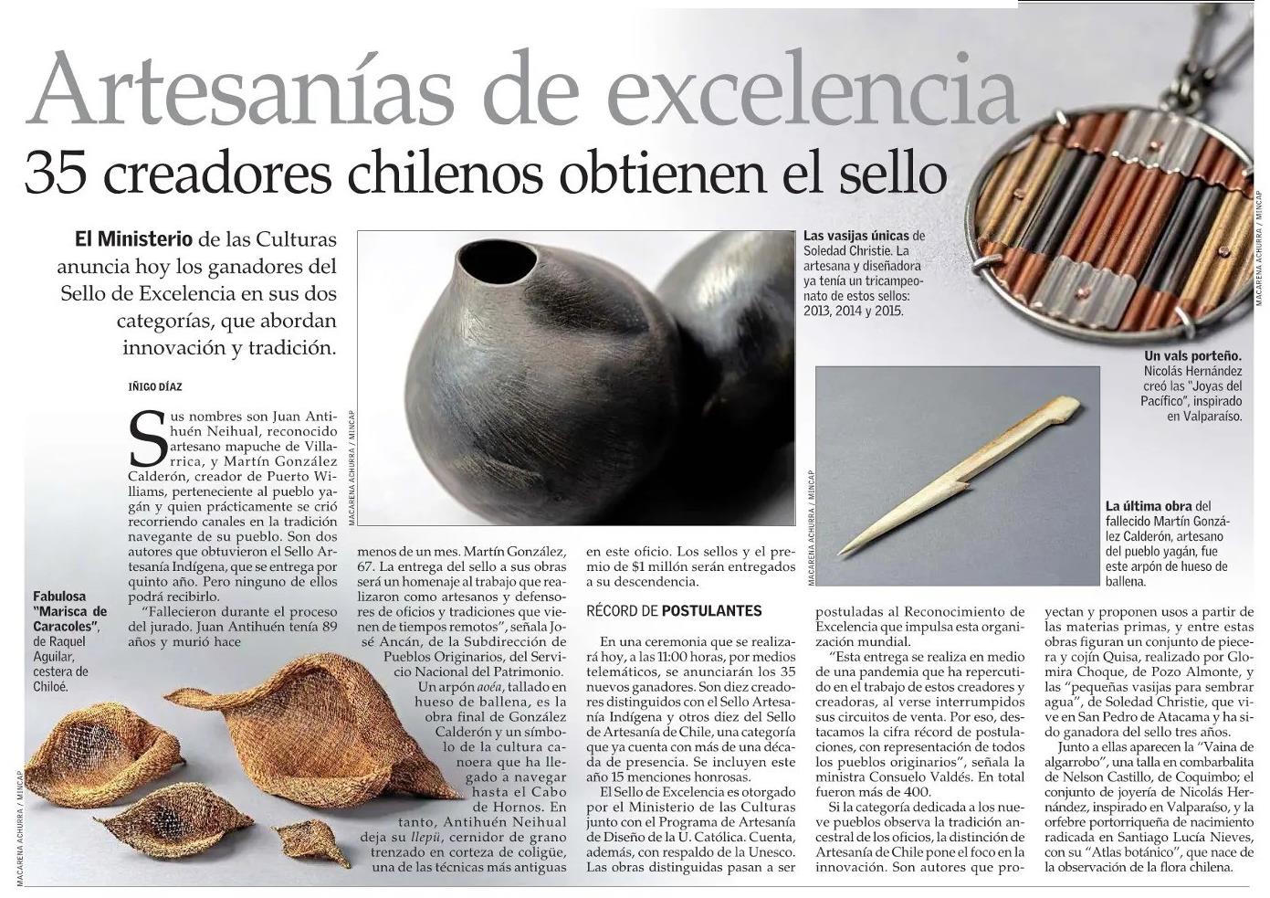 El Mercurio destaca que el Ministerio de las Culturas anuncia hoy los ganadores del Sello de Excelencia en sus dos categorías: Sello Artesanía Indígena y Sello de Artesanía de Chile. El reconocimiento es otorgado por el Ministerio junto con el Programa de Artesanía UC.