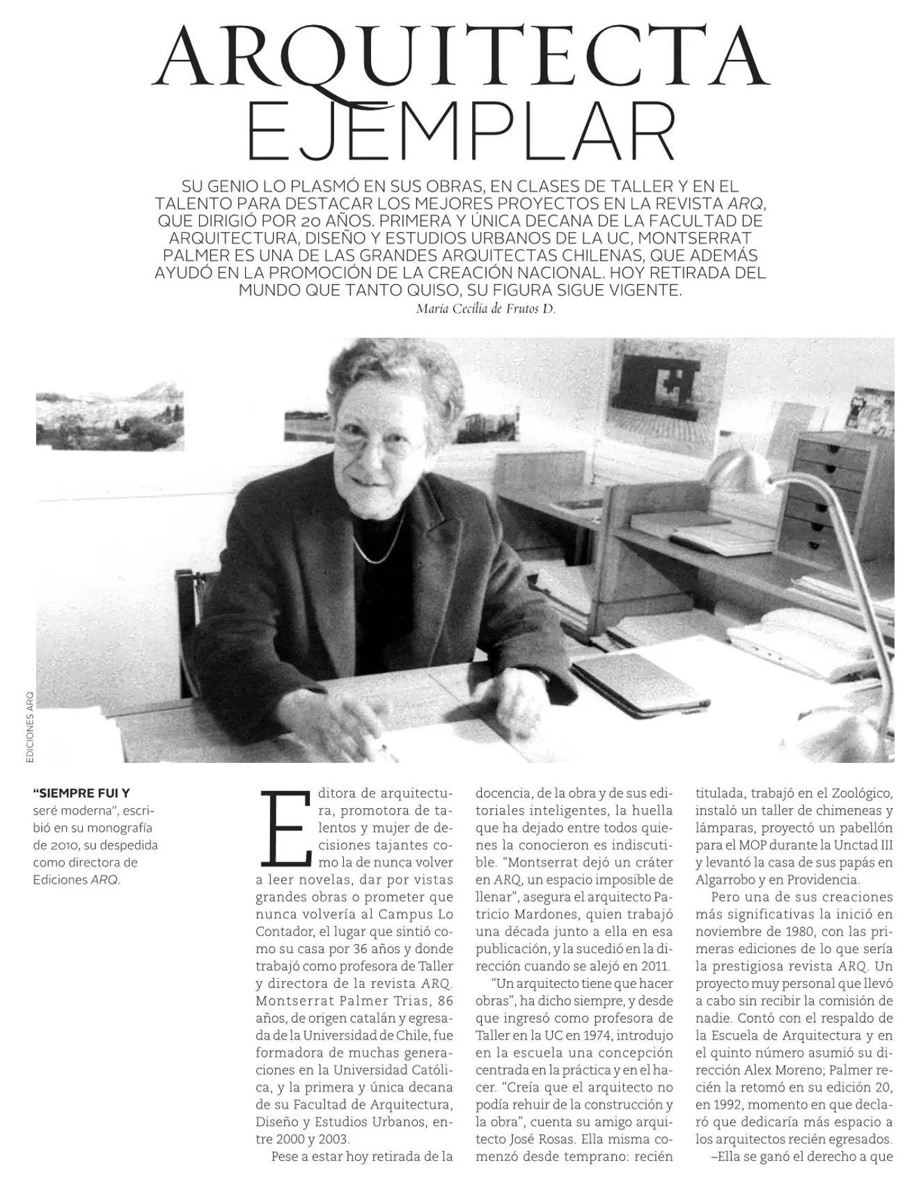 Revista VD de El Mercurio destaca la trayectoria de la arquitecta Monserrat Palmer, ex directora de la revista ARQ y única decana de la Facultad de Arquitectura, Diseño y Estudios Urbanos. Hablan los profesores Patricio Mardones, José Rosas y Rodrigo Pérez de Arce.