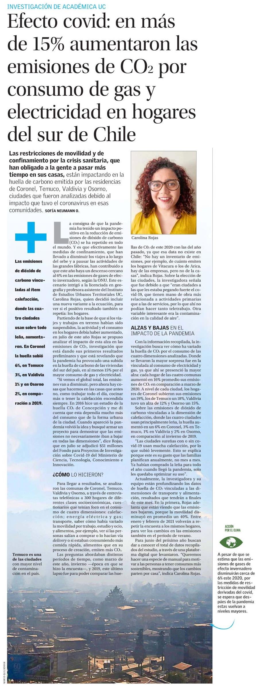 El Mercurio-Innovación publica que investigación de académica UC destaca que en más de 15% aumentaron las emisiones de CO2 por consumo de gas y electricidad en hogares del sur de Chile durante la pandemia. Habla la autora, la profesora del Instituto de Estudios Urbanos, Carolina Rojas. Radio Pauta la entrevista en exclusiva.