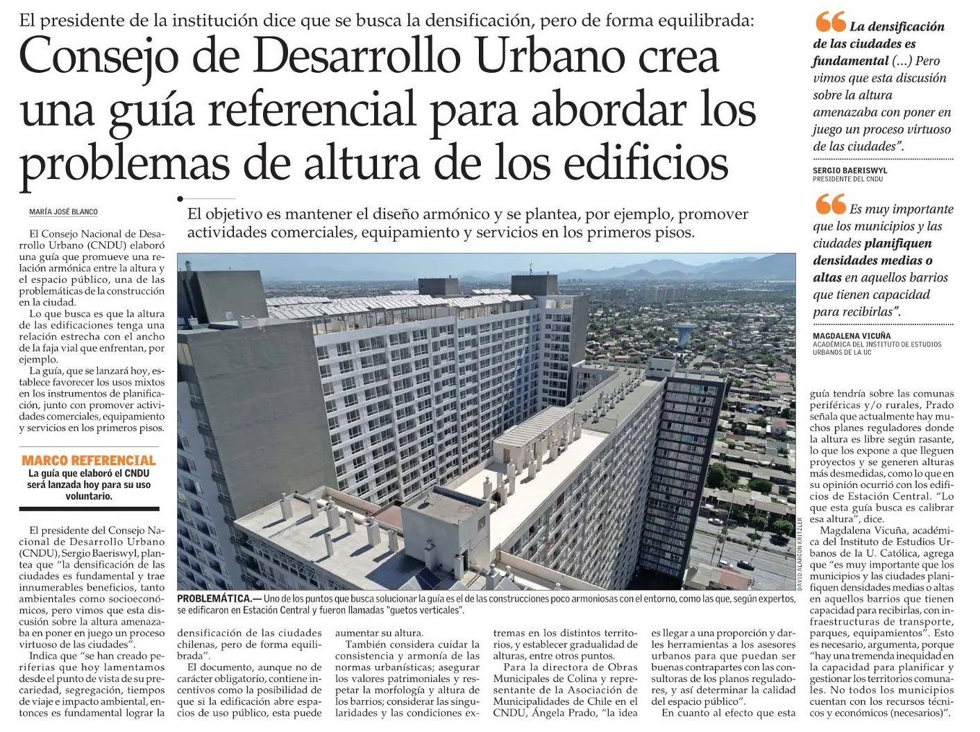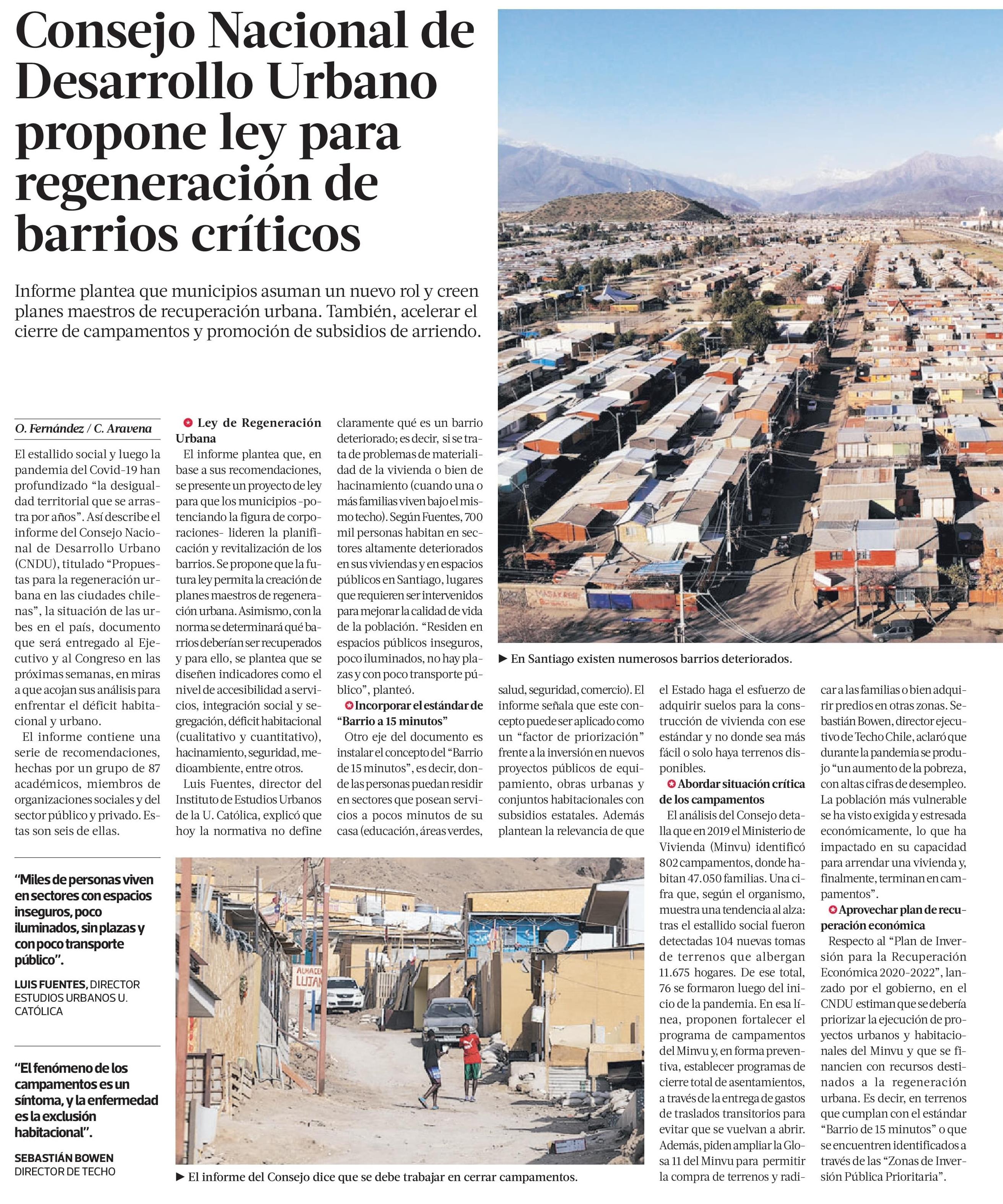 Medios destacan que el Consejo Nacional de Desarrollo Urbano propone ley para regeneración de barrios críticos y que municipios asuman un nuevo rol y creen planes maestros de recuperación urbana. El informe contiene una serie de recomendaciones, hechas por un grupo de 87 académicos, miembros de organizaciones sociales y representantes del sector público y privado. En La Tercera habla el académico Luis Fuentes, director del instituto de Estudios Urbanos, y en El Mercurio, habla la acadómica Magdalena Vicuña.