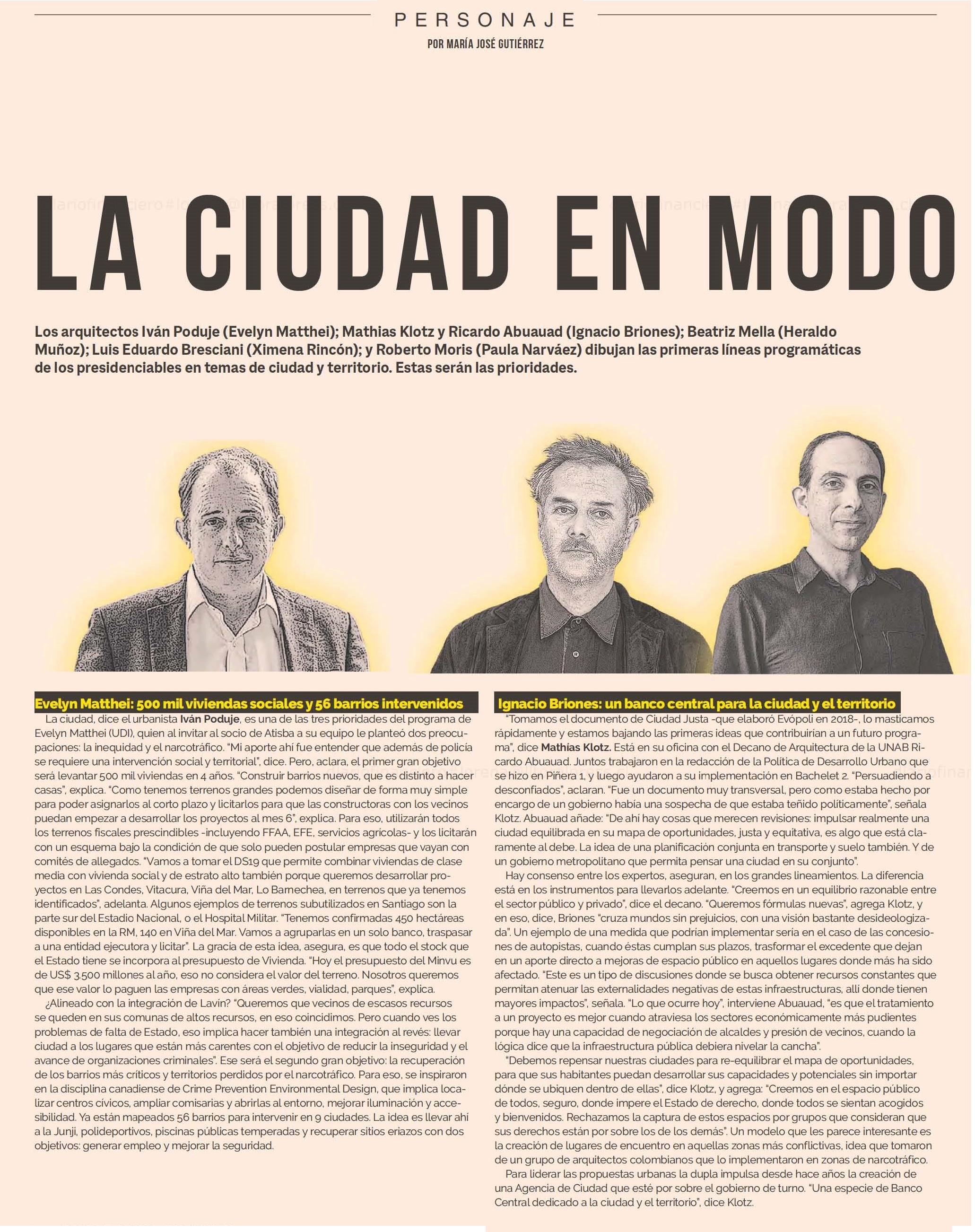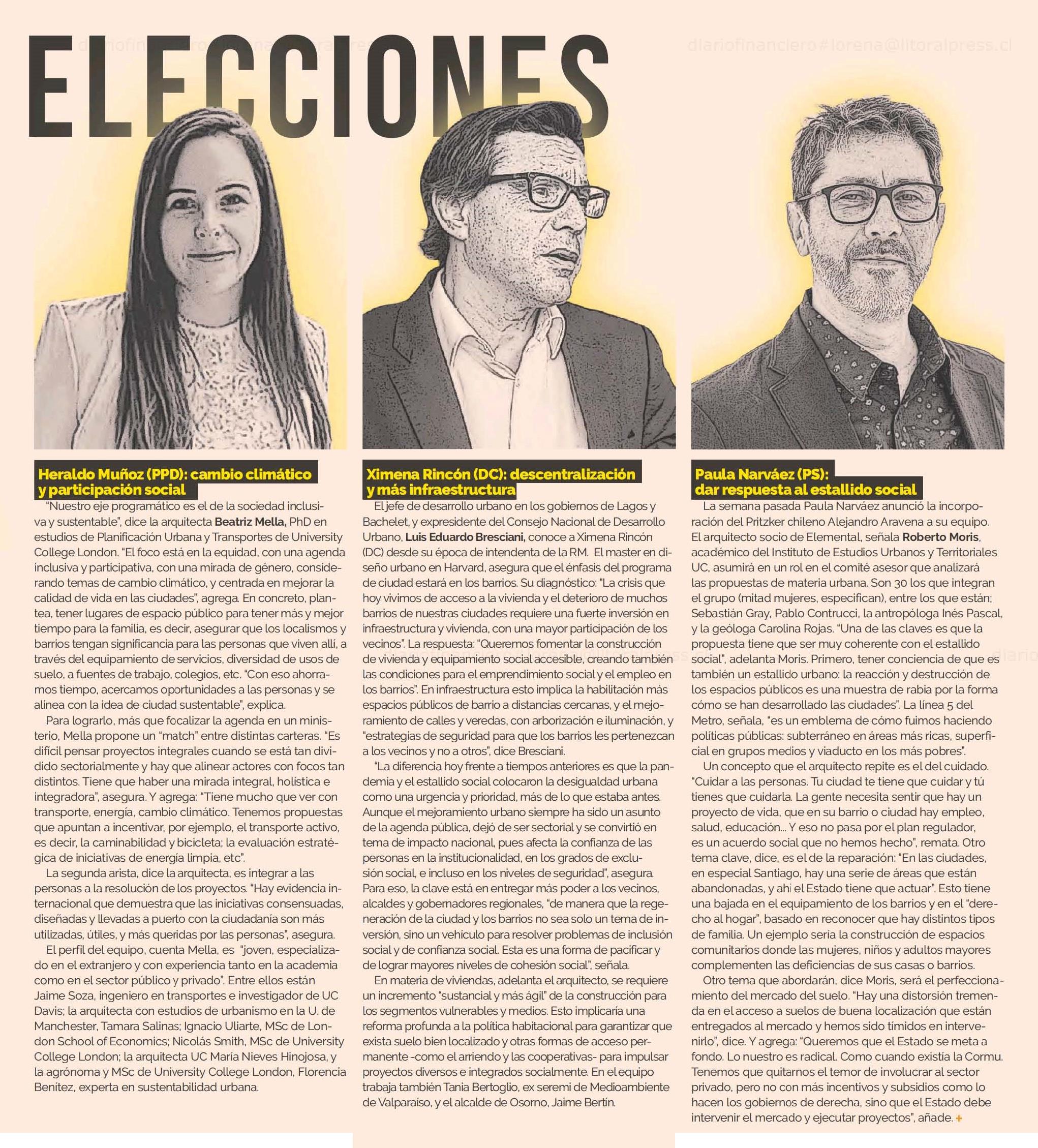 Diario Financiero destaca a los arquitectos que están definiendo las líneas programáticas de los presidenciables en temas de ciudad y territorio. Se menciona a académicos de la Facultad: el director de la Escuela de Arquitectura, Luis Eduardo Bresciani y los academicos, Alejandro Aravena, Roberto Moris y Ricardo Abuauad.