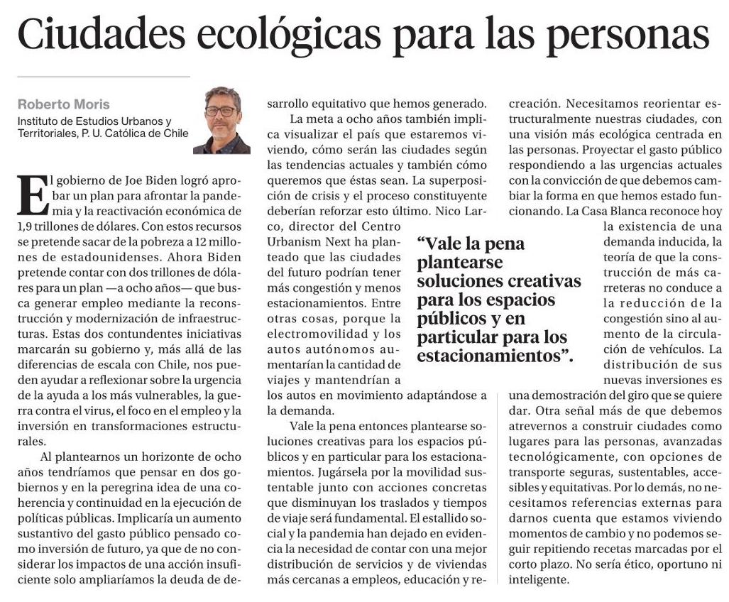 Ciudades ecológicas para las personas Detalles 07 Abril 2021 Visto: 269 Tweet La Segunda publica columna del académico del Instituto de Estudios UrbanosRoberto Moris: "Ciudades ecológicas para las personas". + Revisa columna completa aquí.