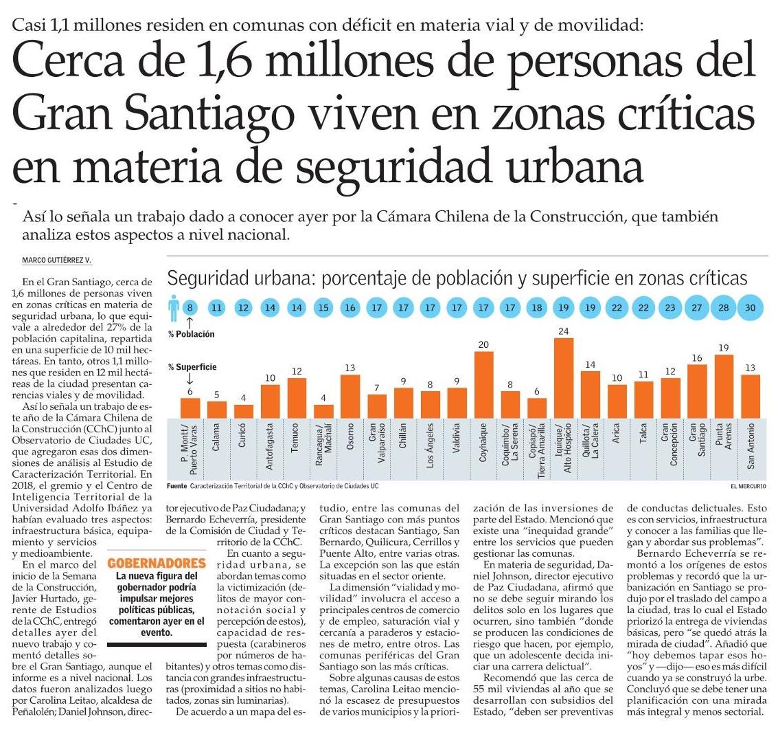 Economía y Negocios de El Mercurio destaca que cerca de 1,6 millones de personas del Gran Santiago viven en zonas críticas en materia de seguridad urbana en el Gran Santiago, de acuerdo a un informe de la Cámara Chilena de la Construcción y el Observatorio de Ciudades UC.