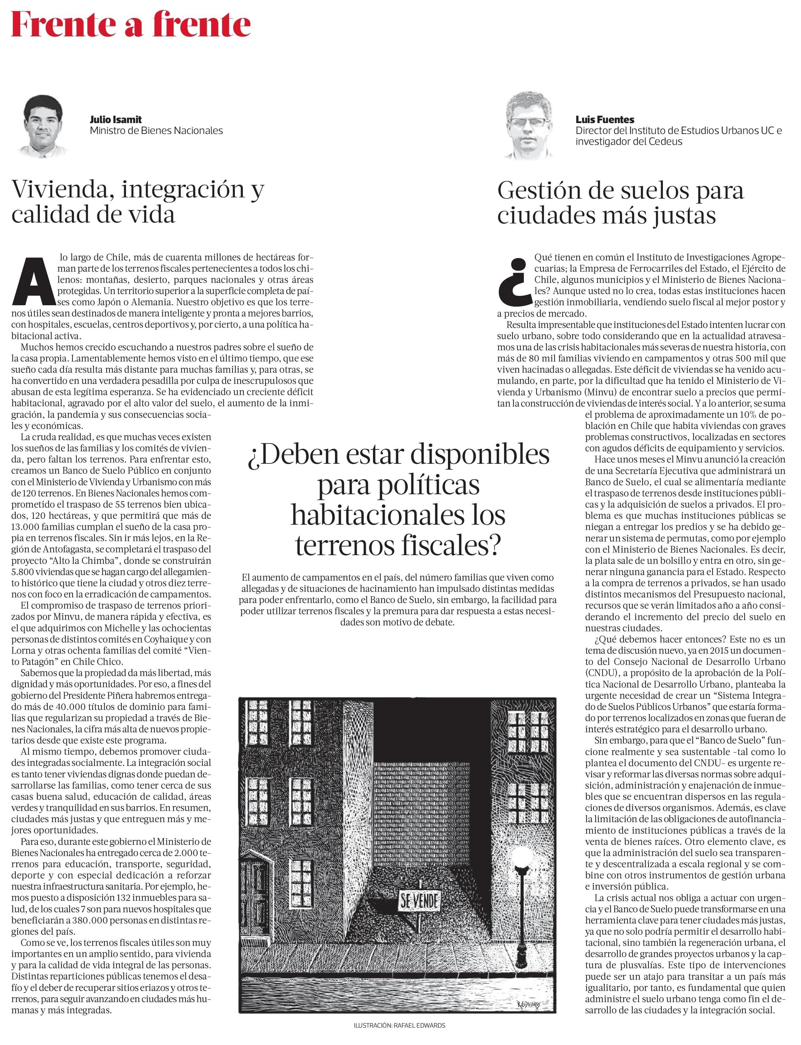 ¿Deben estar disponibles para políticas habitacionales los terrenos fiscales? Detalles 14 Junio 2021 Visto: 430 Tweet La Tercera publica en sección Frente a Frente columna de Luis Fuentes, director del IEUT e investigador del CEDEUS, que responde a la pregunta ¿Deben estar disponibles para políticas habitacionales los terrenos fiscales? + Revisa columna aquí.
