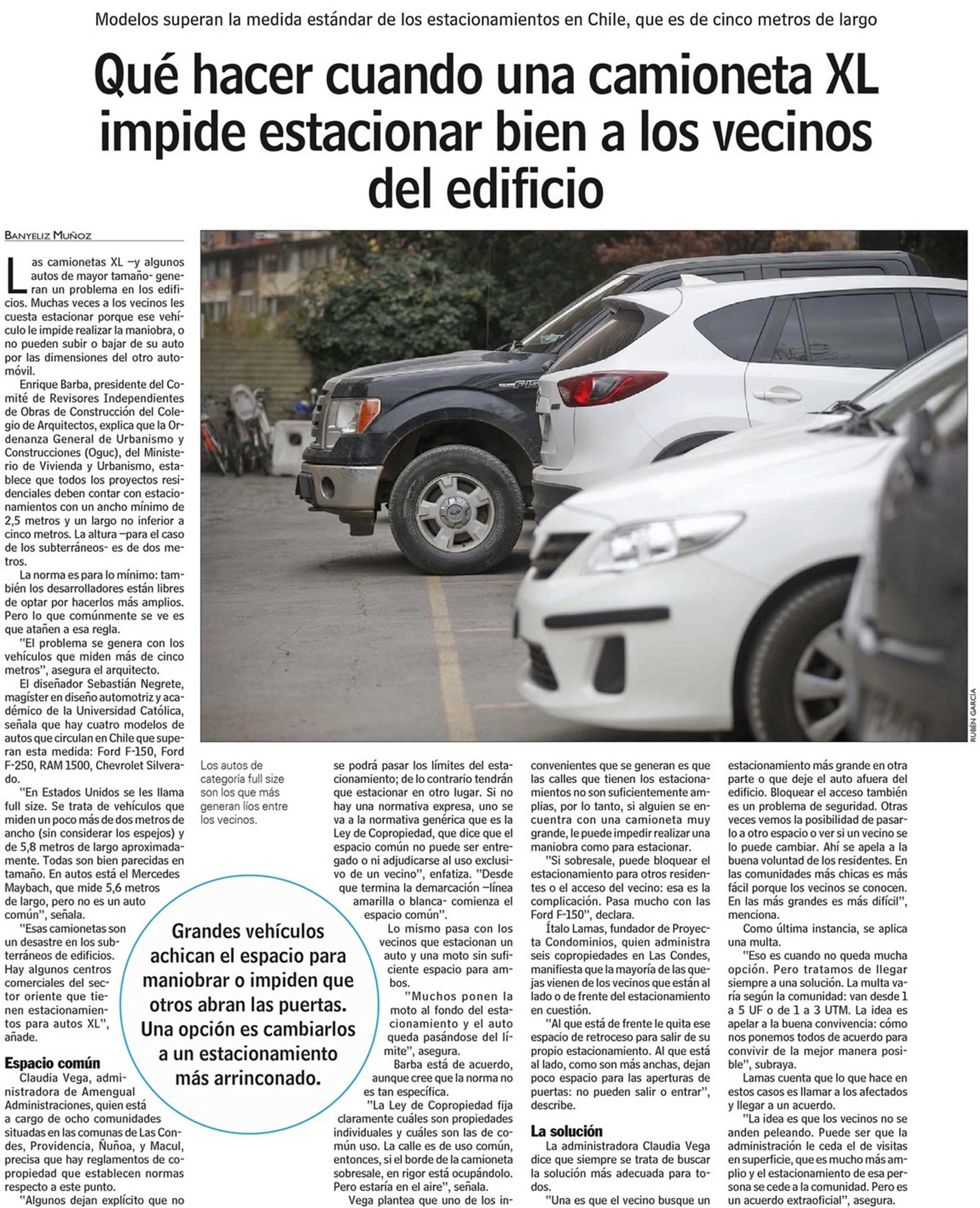 Las Últimas Noticias destaca los problemas que generan los vehículos que superan la medida estándar de los estacionamientos en Chile, que es de cinco metros de largo. Habla el académico de la Escuela de Diseño Sebastián Negrete.