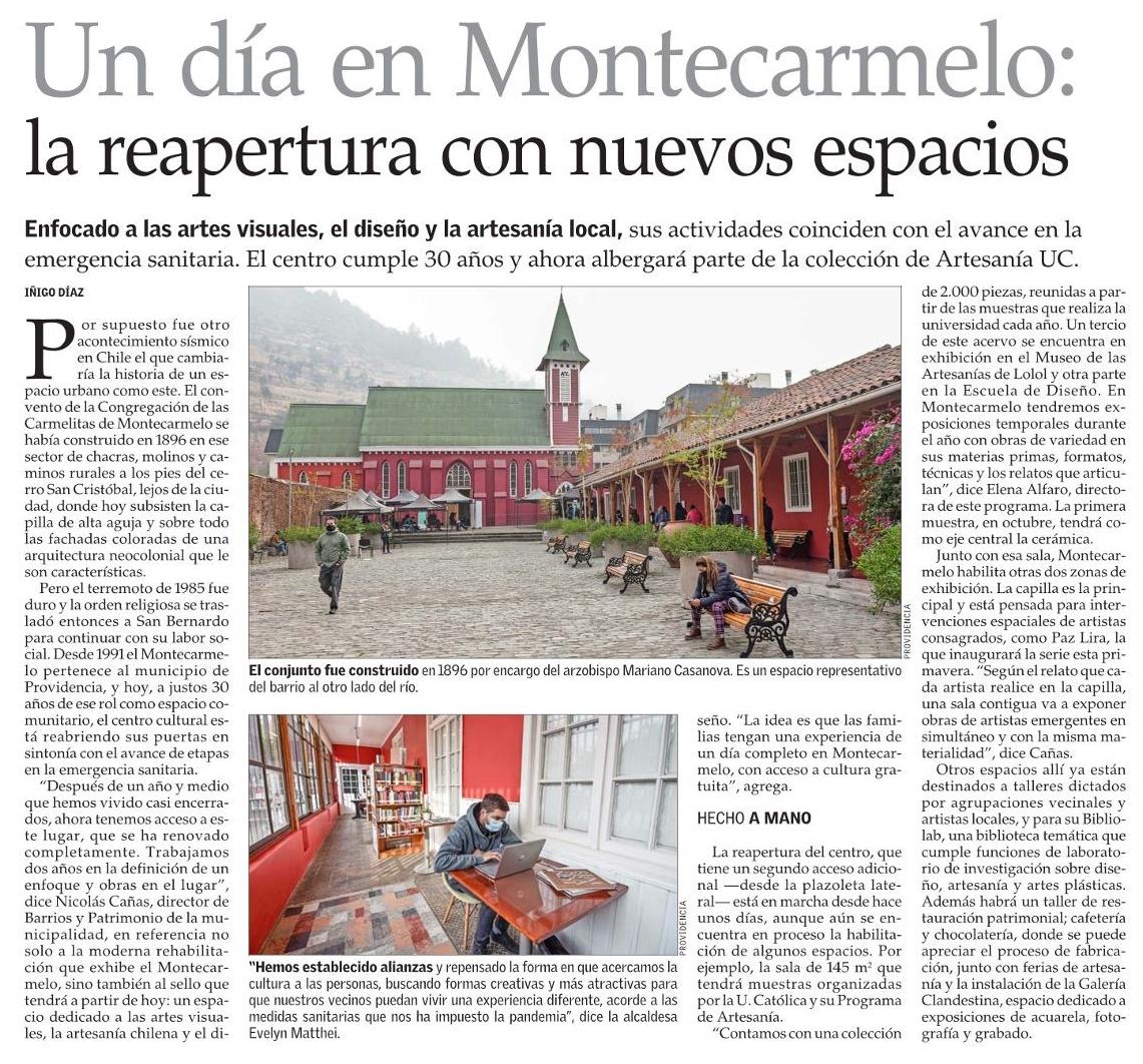 El Mercurio destaca la reapertura de nuevos espacios para las artes visuales, el diseño y la artesanía local en el centro Montecarmelo. Albergará parte de la colección del Programa de Artesanía UC. Habla Elena Alfaro, directora del programa.
