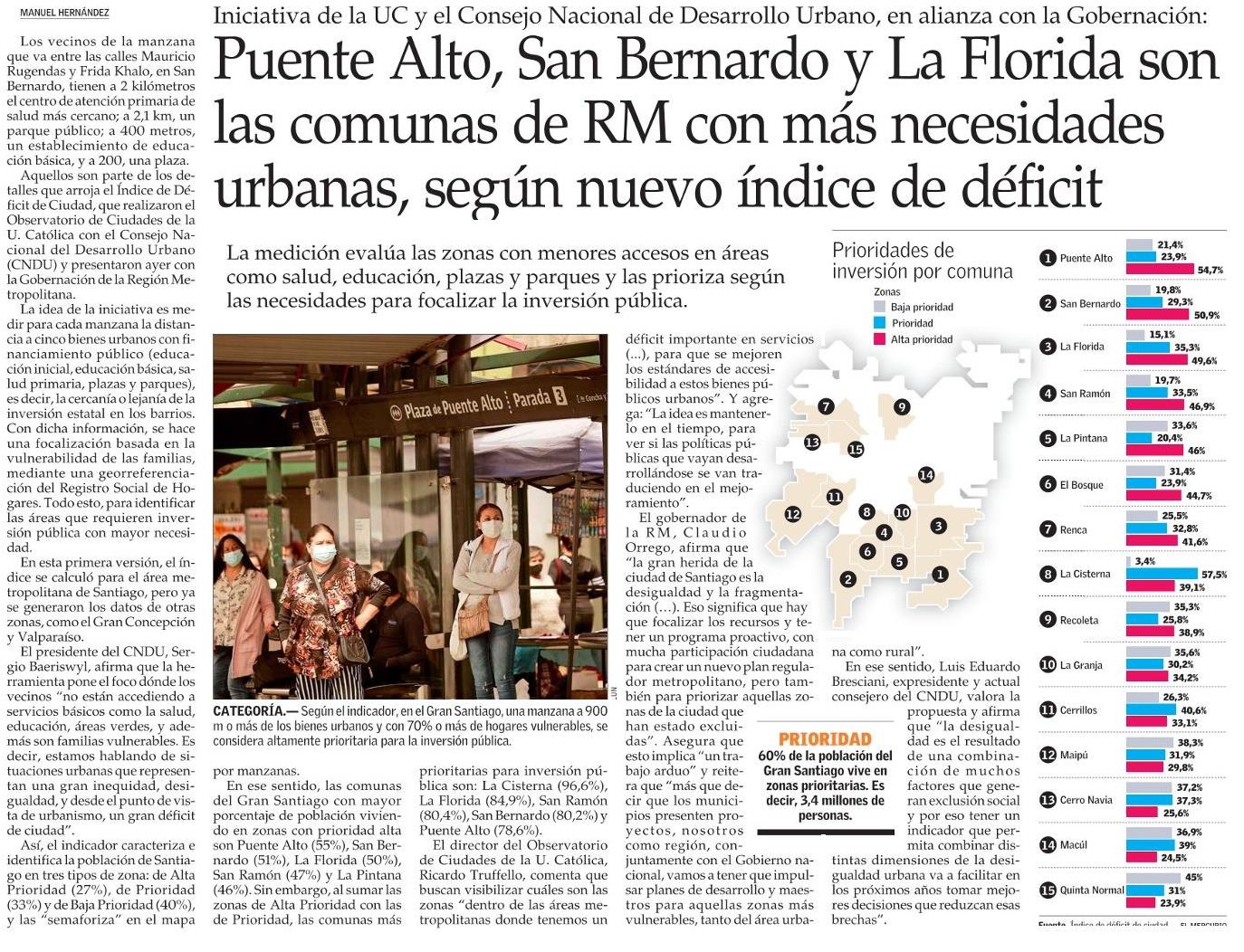 El Mercurio destaca que Puente Alto, San Bernardo y La Florida son las comunas de la Región Metropolitana con más necesidades urbanas, según nuevo Índice de Déficit de Ciudad, que realizaron el Observatorio de Ciudades UC y el Consejo Nacional del Desarrollo Urbano. La idea de la iniciativa es medir para cada manzana la distancia a cinco bienes urbanos con financiamiento público: educación inicial, educación básica, salud primaria, plazas y parques. Habla el director del Observatorio de Ciudades, Ricardo Truffello.