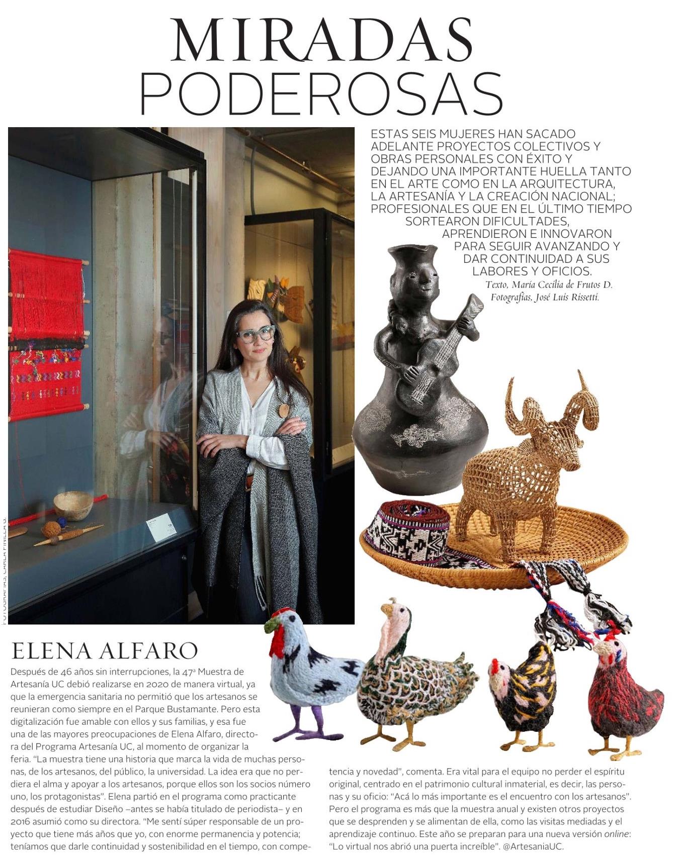Revista VD de El Mercurio destaca a seis mujeres que han impulsado exitosamente proyectos vinculados al arte, arquitectura, artesanía y creación nacional. Habla Elena Alfaro, directora del Programa Artesanía UC que organiza la Muestra de Artesanía UC.