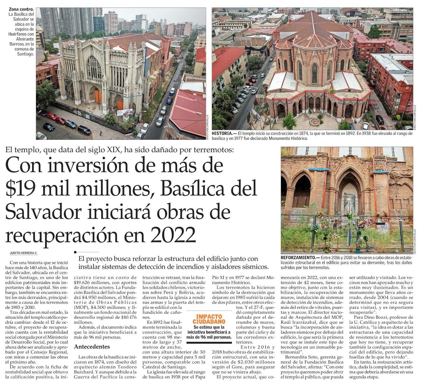 Con inversión de más de $19 mil millones, Basílica del Salvador iniciará obras de recuperación en 2022 Detalles 25 Octubre 2021 Visto: 667 Tweet El Mercurio destaca que con una inversión de más de $19 mil millones, la Basílica del Salvador iniciará obras de recuperación en 2022. Habla el profesor Dino Bozzi. + Revisa nota completa aquí.