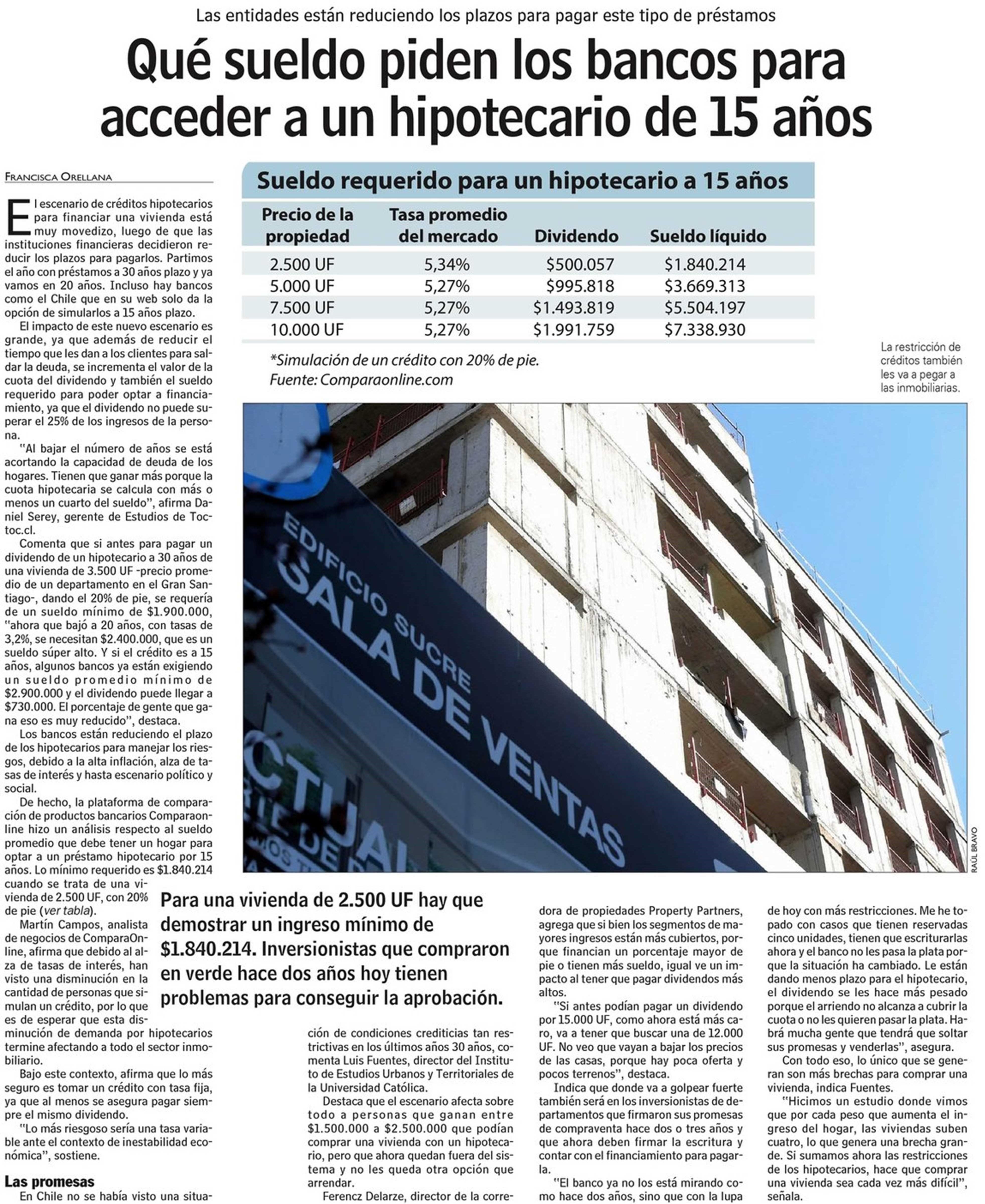 Qué sueldo piden los bancos para acceder a un hipotecario de 15 años Detalles 24 Octubre 2021 Visto: 508 Tweet Las Últimas Noticias destaca que los bancos están reduciendo los plazos para pagar los préstamos hipotecarios. Habla Luis Fuentes, director del Instituto de Estudios Urbanos. + Revisa nota completa aquí.