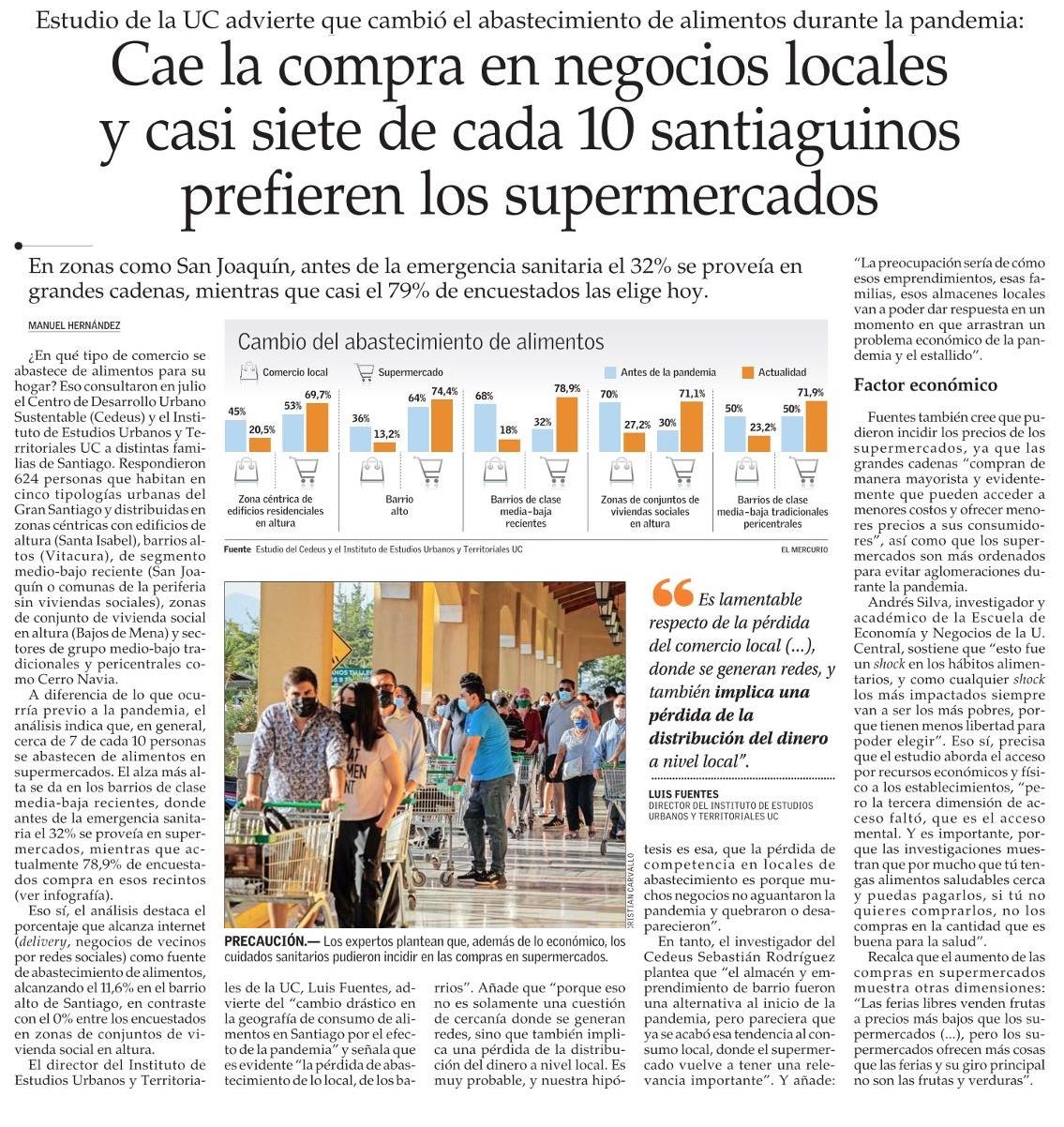 El Mercurio destaca que estudio de la UC revela caída de la compra en negocios locales durante la pandemia: casi siete de cada 10 santiaguinos prefieren los supermercados. La consulta fue realizada por el Centro de Desarrollo Urbano Sustentable (Cedeus) y el instituto UC. Habla el director del Instituto de Estudios Urbanos, Luis Fuentes, y el investigador del Cedeus Sebastián Rodríguez.