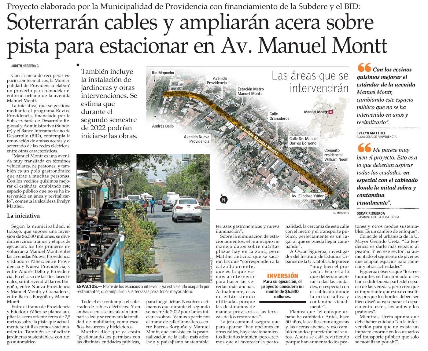 El Mercurio destaca que proyecto elaborado por la Municipalidad de Providencia con financiamiento de la Subdere y el BID soterrará cables y ampliará acera en Av. Manuel Montt. Habla el investigador del IEUT, Óscar Figueroa.