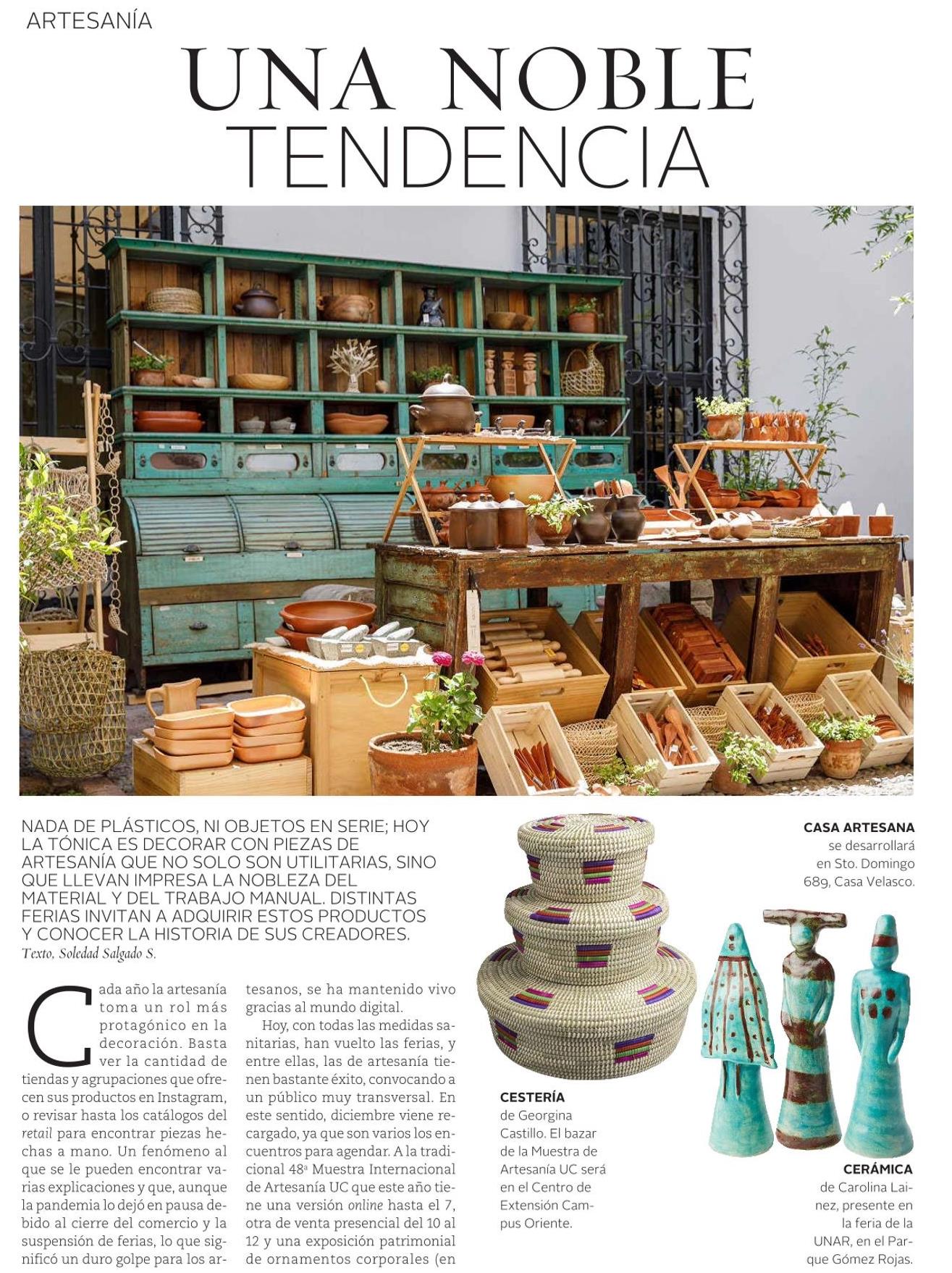 Una noble tendencia Detalles 06 Diciembre 2021 Visto: 386 Tweet Revista VD de El Mercurio destaca distintas ferias de artesanía en diciembre, entre ellas, la 48° Muestra Internacional de Artesanía UC. Habla Elena Alfaro, directora del Programa de Artesanía UC. + Revisa nota completa aquí.
