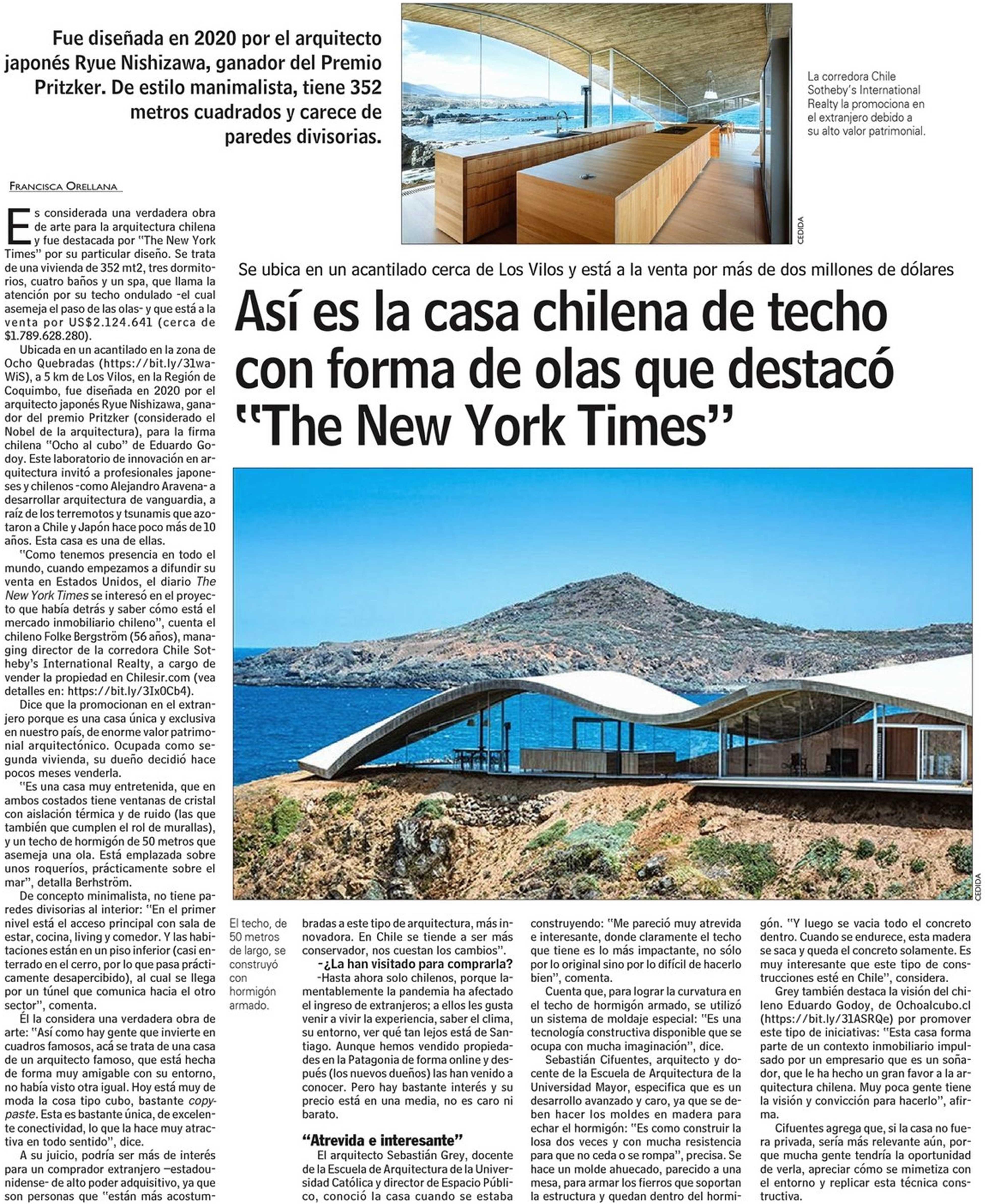 Las Últimas Noticias destaca la casa chilena con forma de olas, diseñada por el ganador del Premio Pritzker Ryue Nishizawa, que fue elogiada por "The New York Times". Habla el profesor de la Escuela de Arquitectura, Sebastián Gray.