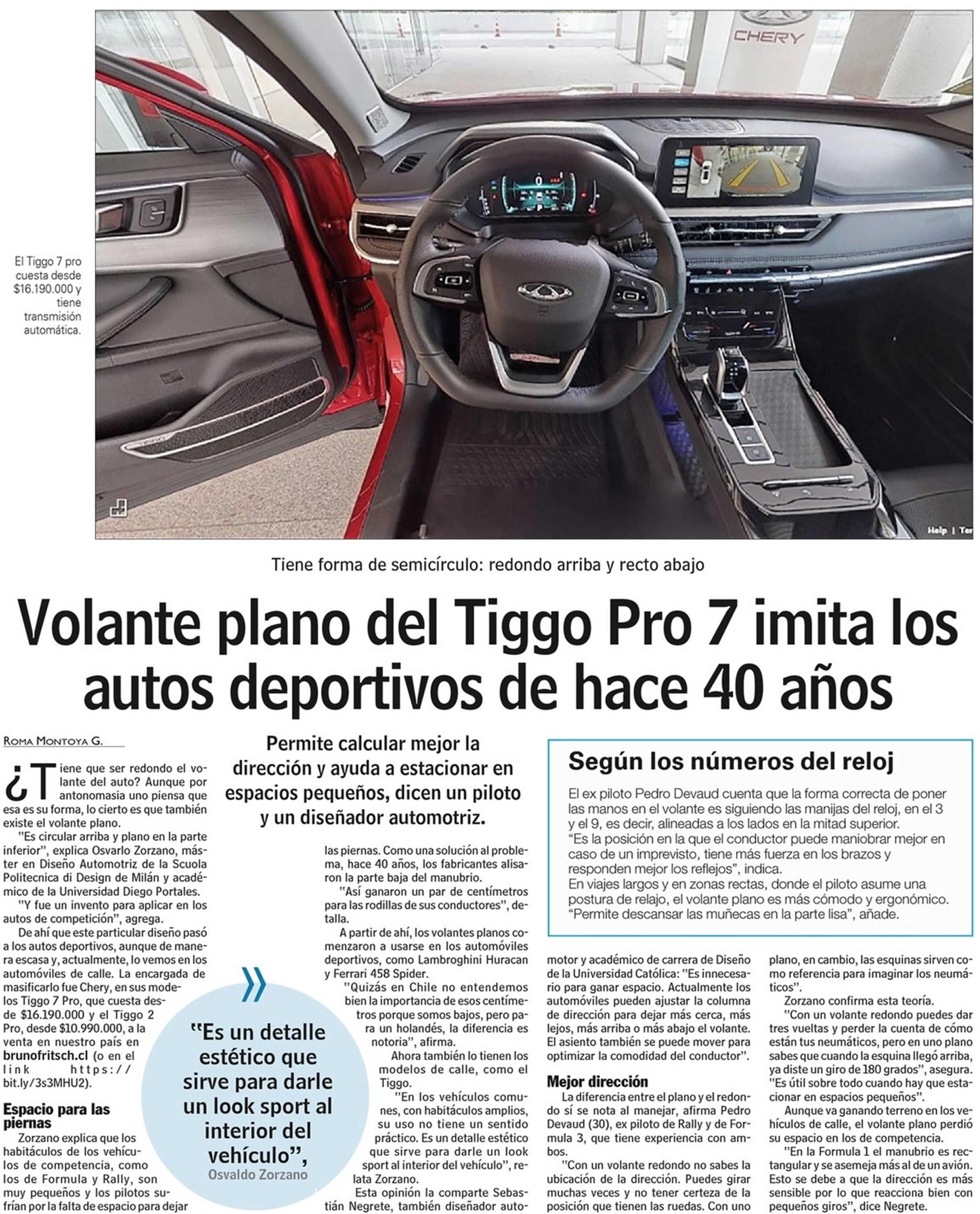 Las Últimas Noticias destaca que volante plano en su parte inferior del Tiggo 7 Pro de Chery imita los autos deportivos de hace 40 años. Habla el académico de la Esucela de Diseño, Sebastián Negrete.