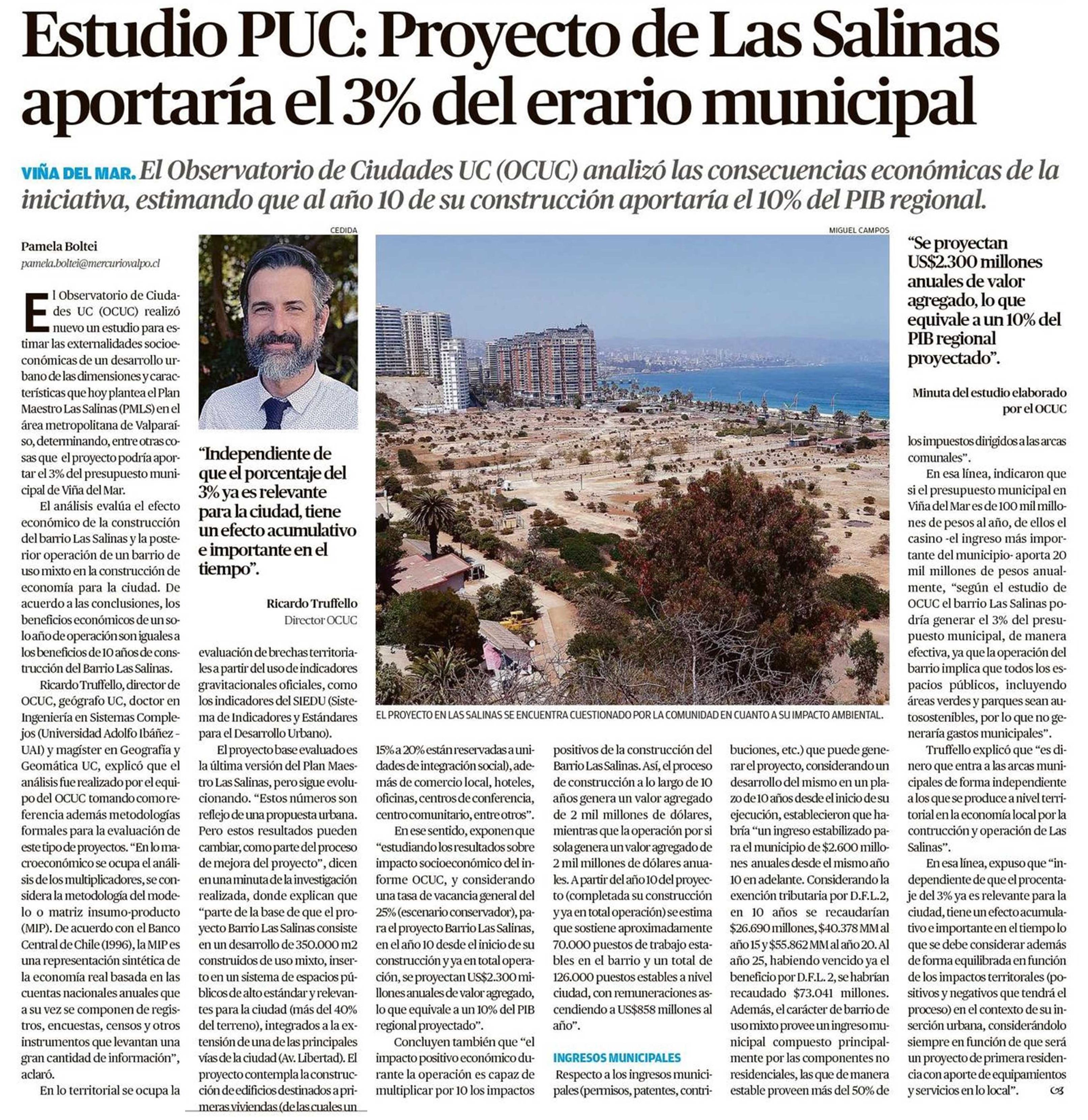 Estudio PUC: Proyecto de Las Salinas aportaría el 3% del erario municipal Detalles 27 Diciembre 2021 Visto: 478 Tweet El Mercurio de Valparaíso destaca un análisis realizado por el Observatorio de Ciudades UC. Analizó las consecuencias económicas del proyecto Las Salinas. Habla su director Ricardo Truffelo. + Revisa nota completa aquí.