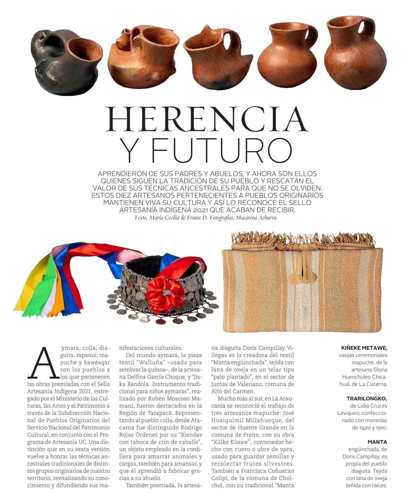 Revista VD de El Mercurio destaca que diez artesanos pertenecientes a pueblos originarios fueron premiadas con el Sello Artesanía Indígena 2021, entregado por el Ministerio de las Culturas, las Artes y el Patrimonio en conjunto con el Programa de Artesanía UC.