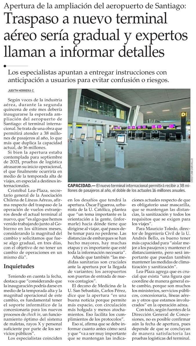 El Mercurio destaca que apertura de la ampliación del aeropuerto de Santiago sería gradual y expertos llaman a entregar instrucciones con anticipación a usuarios para evitar confusión o riesgos. Durante la segunda quincena de este mes debería inaugurarse. Habla el académico del IEUT, Óscar Figueroa.