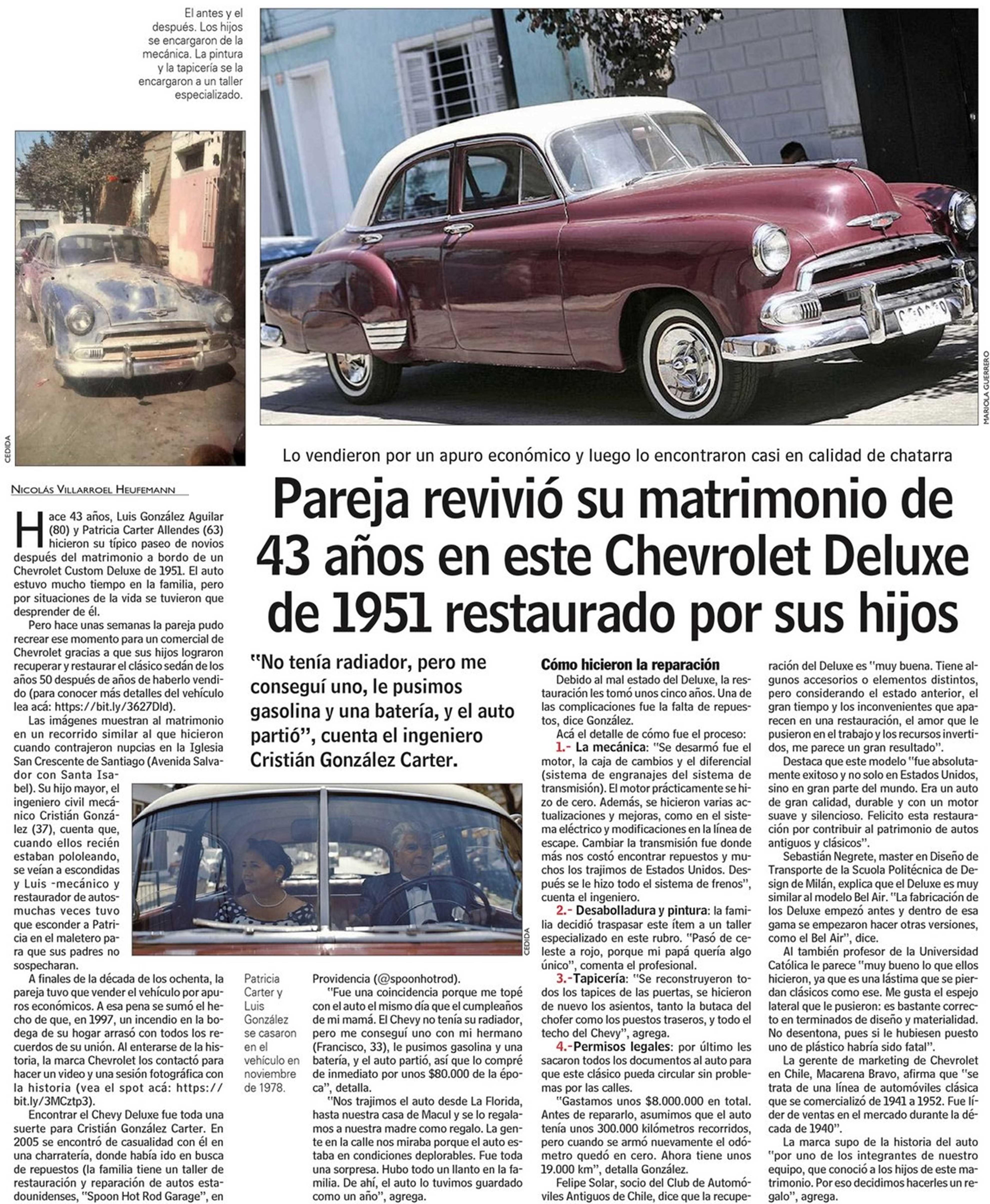 Las Últimas Noticias destaca que pareja revivió su matrimonio de 43 años en un Chevrolet Deluxe de 1951 restaurado por sus hijos. Habla el profesor de la Escuela de Diseño Sebastián Negrete.