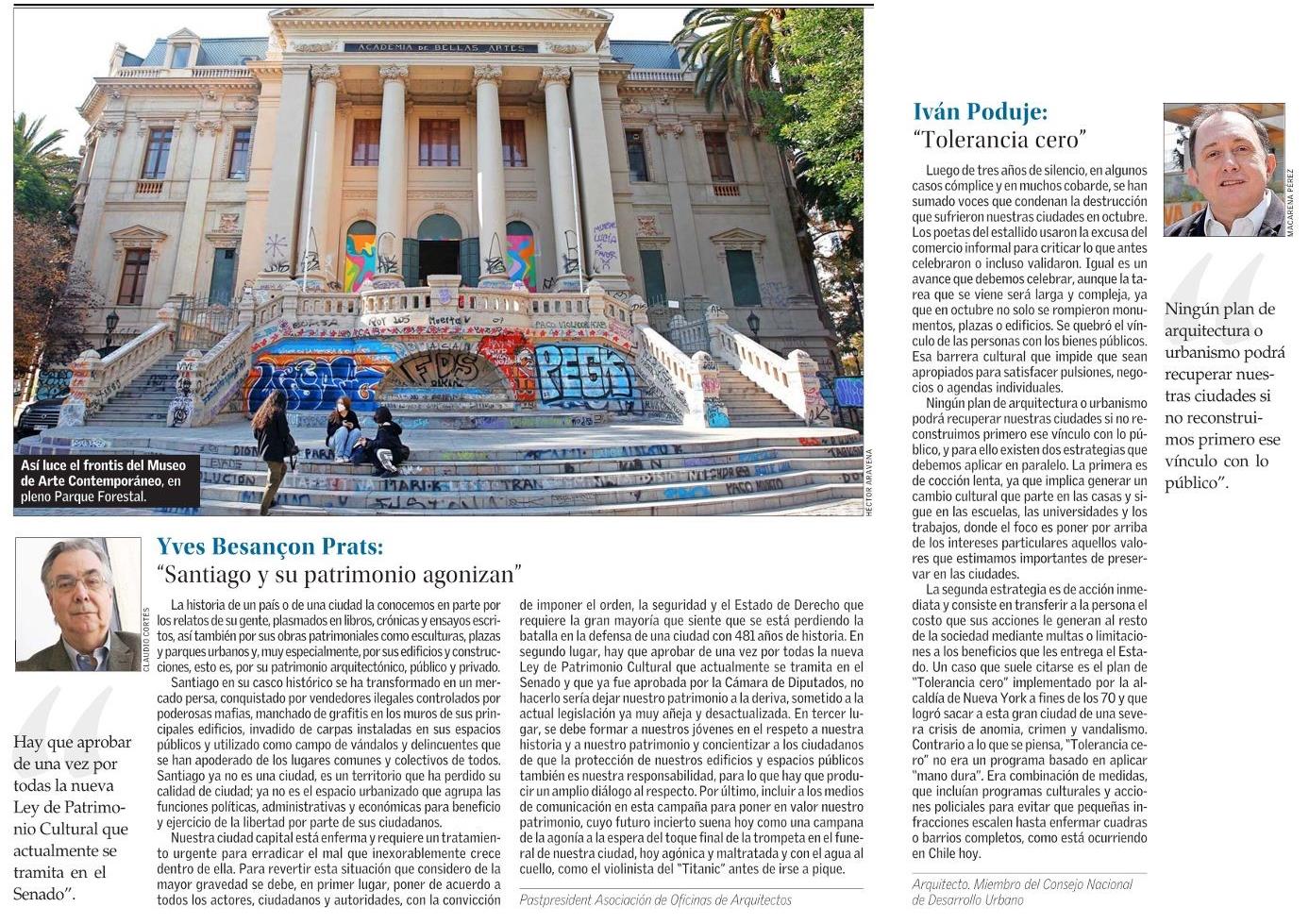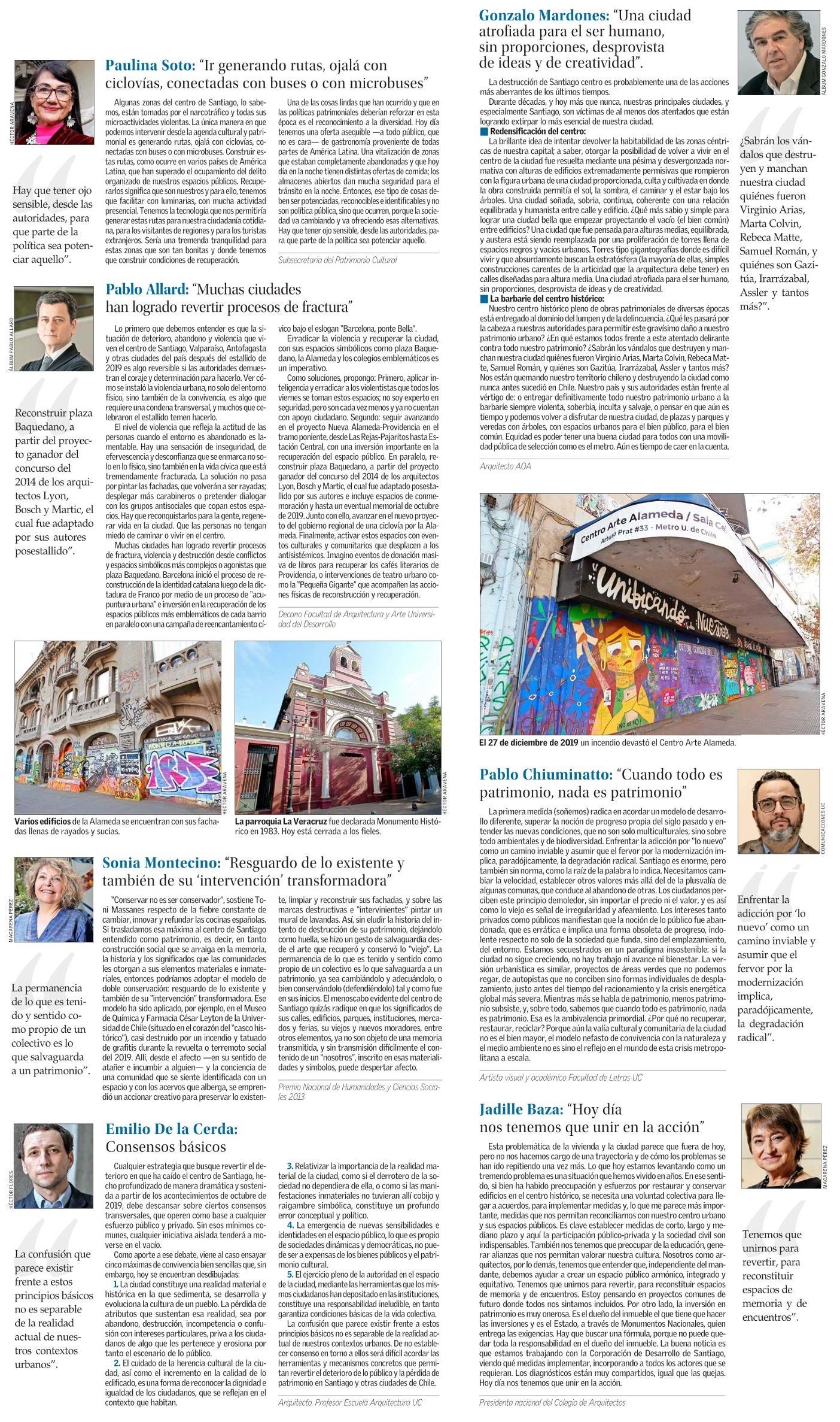 Artes y Letras de El Mercurio destaca, en el marco del Día de los Patrimonios, el deterioro del centro histórico de Santiago, uno de los espacios urbanos con mayor riqueza patrimonial del país. Nueve expertos en temas de arquitectura, conservación y patrimonio señalan sus medidas y sugerencias para revertir esta situación. Habla el profesor de la escuela de Arquitectura, Emilio De la Cerda y el artista visual y académico Facultad de Letras UC, Pablo Chiuminatto.