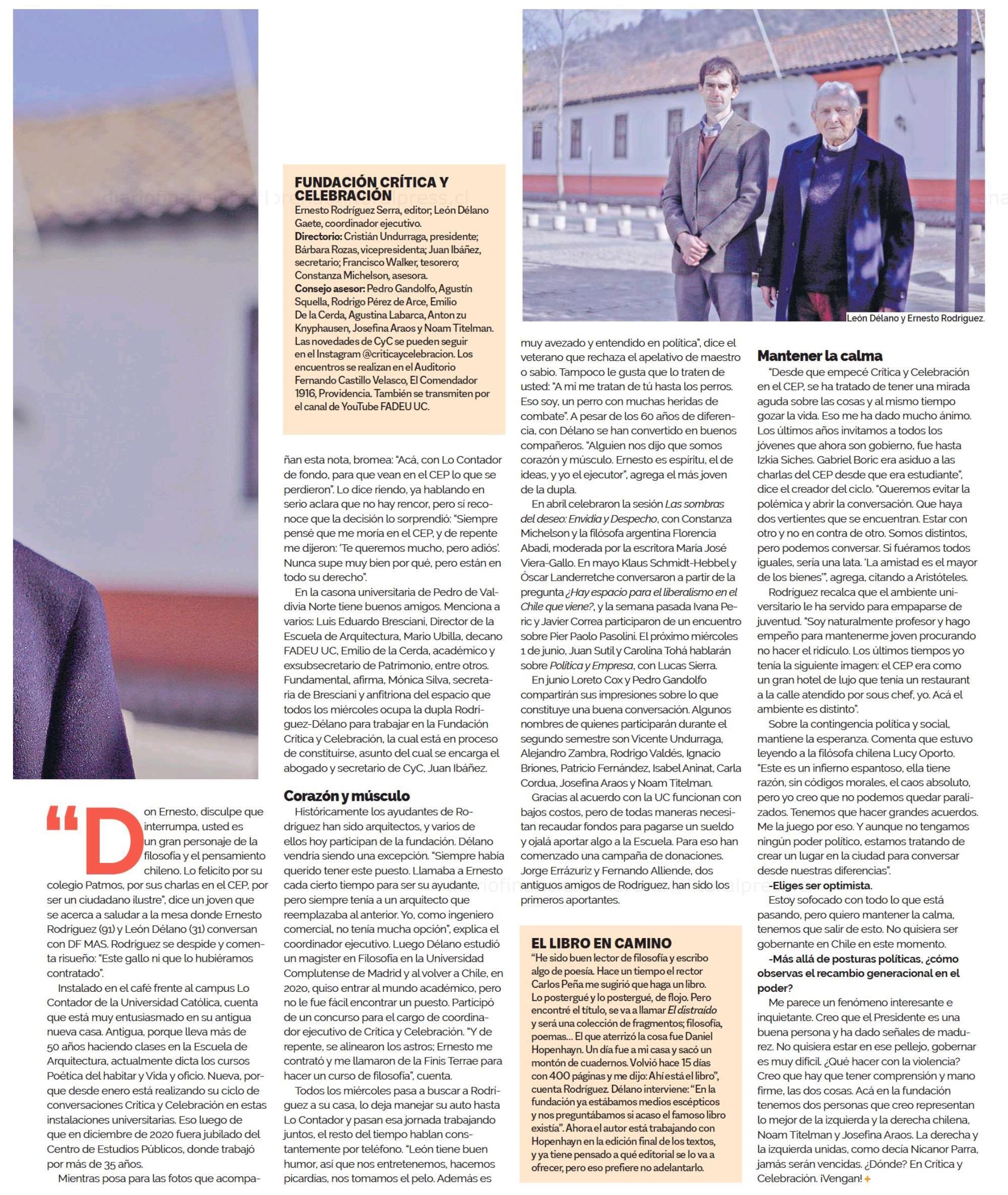 Diario Financiero destaca que el profesor Ernesto Rodríguez está realizando su ciclo de conversaciones Crítica y Celebración en el Campus Lo Contador UC. Los encuentros se realizan en el Auditorio Fernando Castillo Velasco y se transmiten por el canal de YouTube de la facultad.