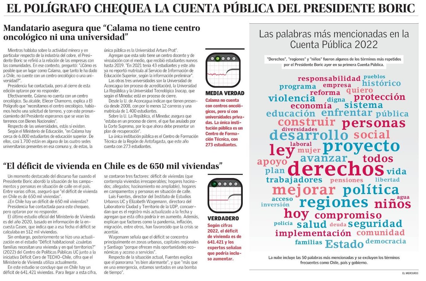 El Mercurio chequea en El Polígrafo la cuenta pública del Presidente, que aseguró que "el déficit de vivienda en Chile es de 650 mil viviendas". Se cita el estudio "Déficit habitacional: ¿cuántas familias necesitan una vivienda y en qué territorios?" del Centro de Políticas Públicas UC junto a la iniciativa Déficit Cero de Techo-Chile. Habla Luis Fuentes, director del Instituto de Estudios Urbanos.