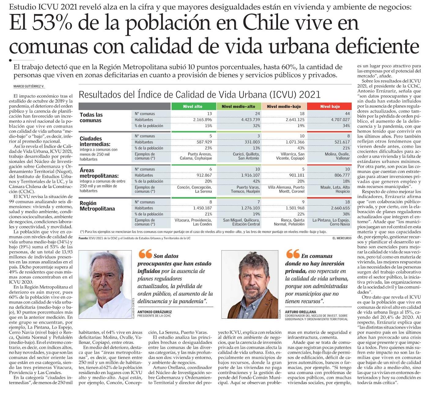 Economía y Negocios de El Mercurio destaca que el Índice de Calidad de Vida Urbana, ICVU 2021, revela que el 53% de la población en Chile vive en comunas con calidad de vida urbana deficiente y que en la Región Metropolitana hasta 60% vive en zonas deficitarias en cuanto a provisión de bienes y servicios públicos y privados. El trabajo fue desarrollado por profesionales del Núcleo de Investigación sobre Gobernanza y Ordenamiento Territorial (Nugot), del instituto UC, y la Cámara Chilena de la Construcción. Habla Arturo Orellana, director del proyecto ICVU.
