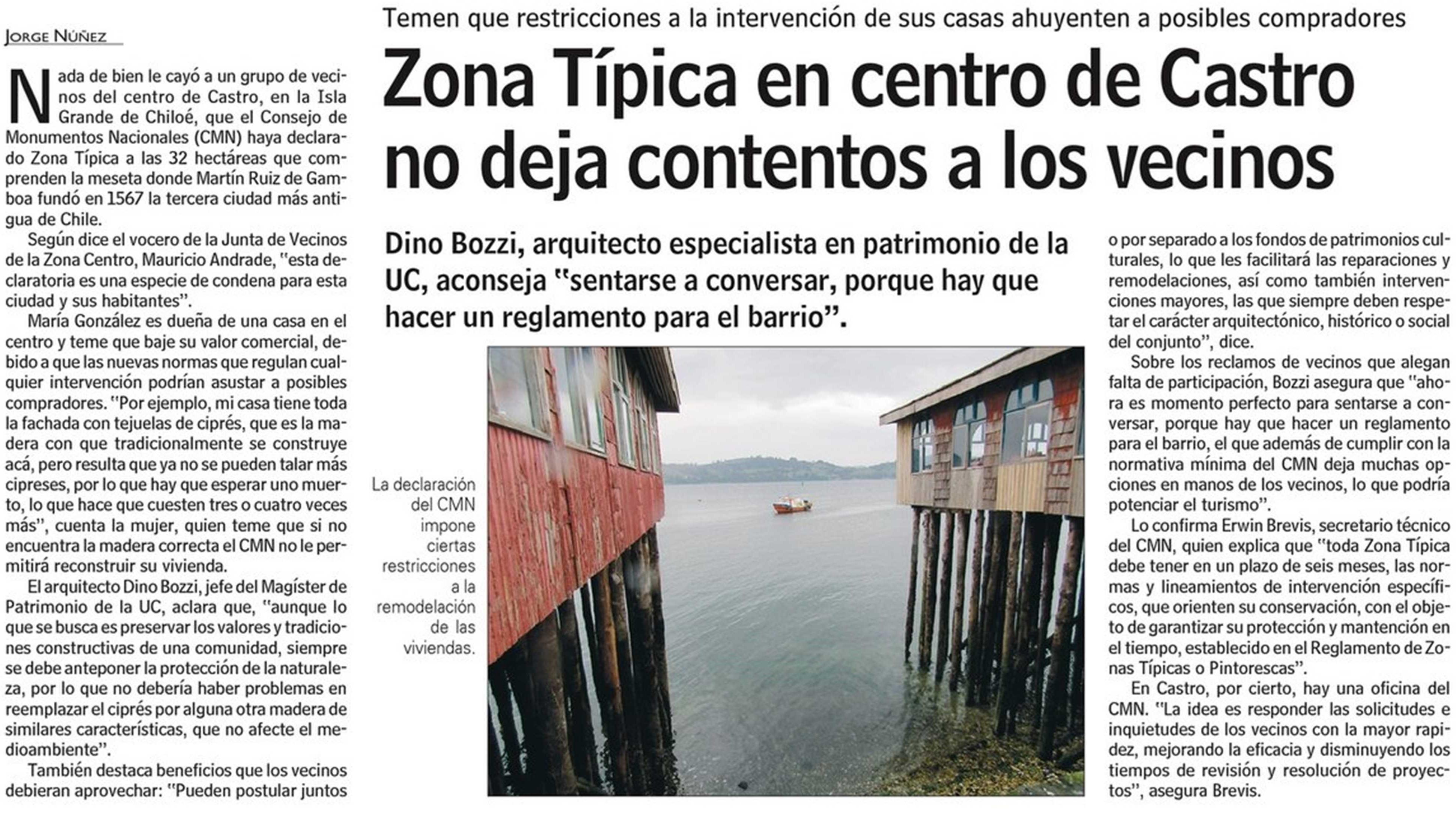 PRENSA I Zona Típica en centro de Castro no deja contentos a los vecinos Detalles 01 Julio 2022 Visto: 300 Tweet Las Últimas Noticias destaca que vecinos temen que declaración de Zona Típica de centro de Castro ahuyente a posibles compradores. Habla el académico de la escuela de Arquitectura, Dino Bozzi. + Revisa nota completa aquí.