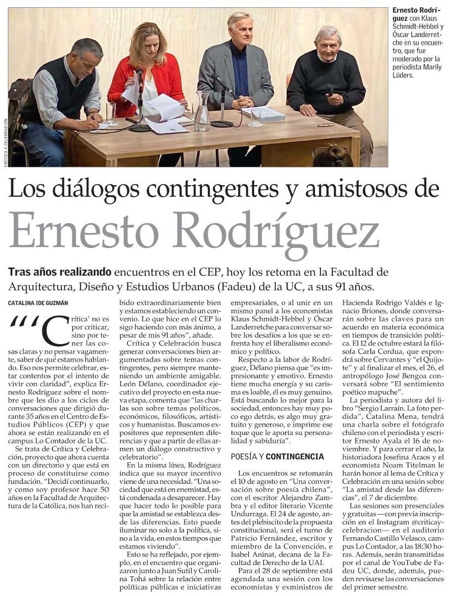 El Mercurio destaca que ciclo de diálogos Crítica y Celebración, liderado por Ernesto Rodríguez, se retoma en el Campus Lo Contador. Las sesiones serán transmitidas por el canal de YouTube de Fadeu UC.