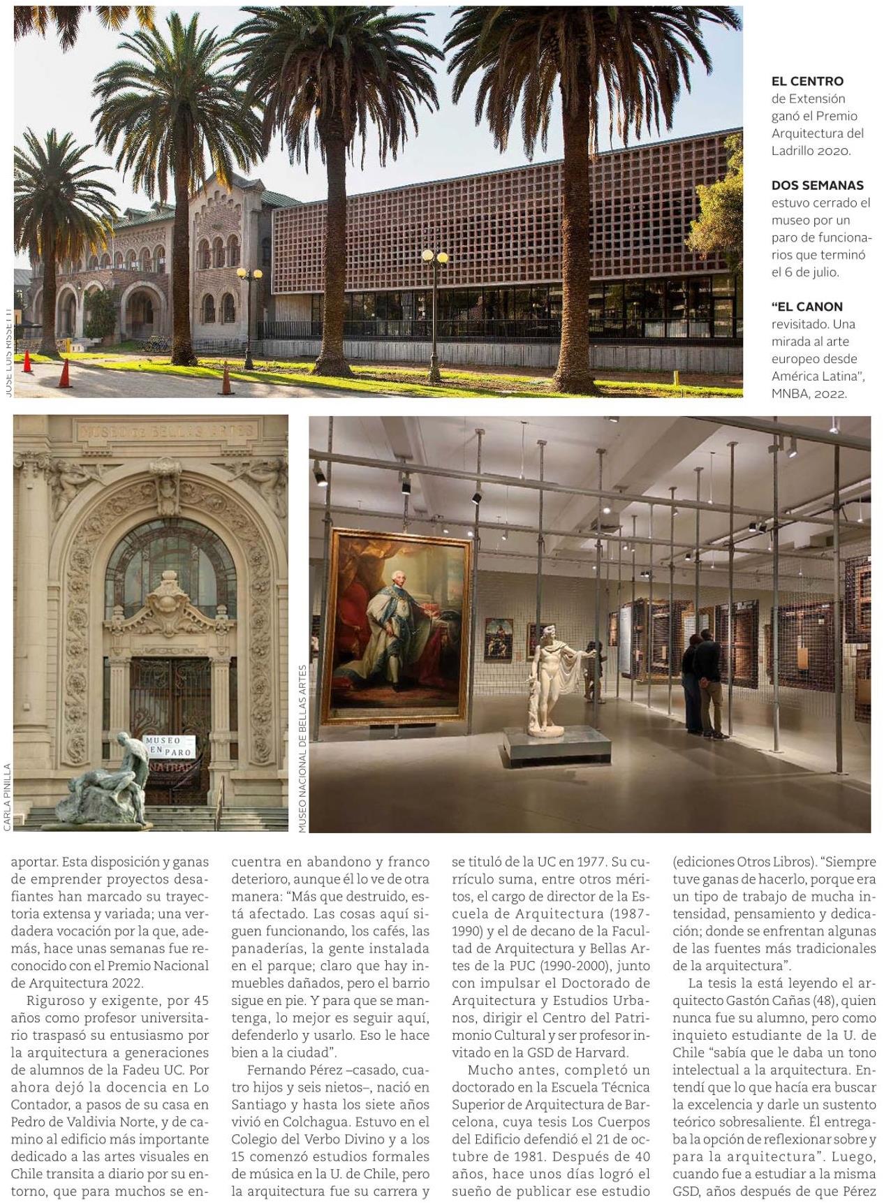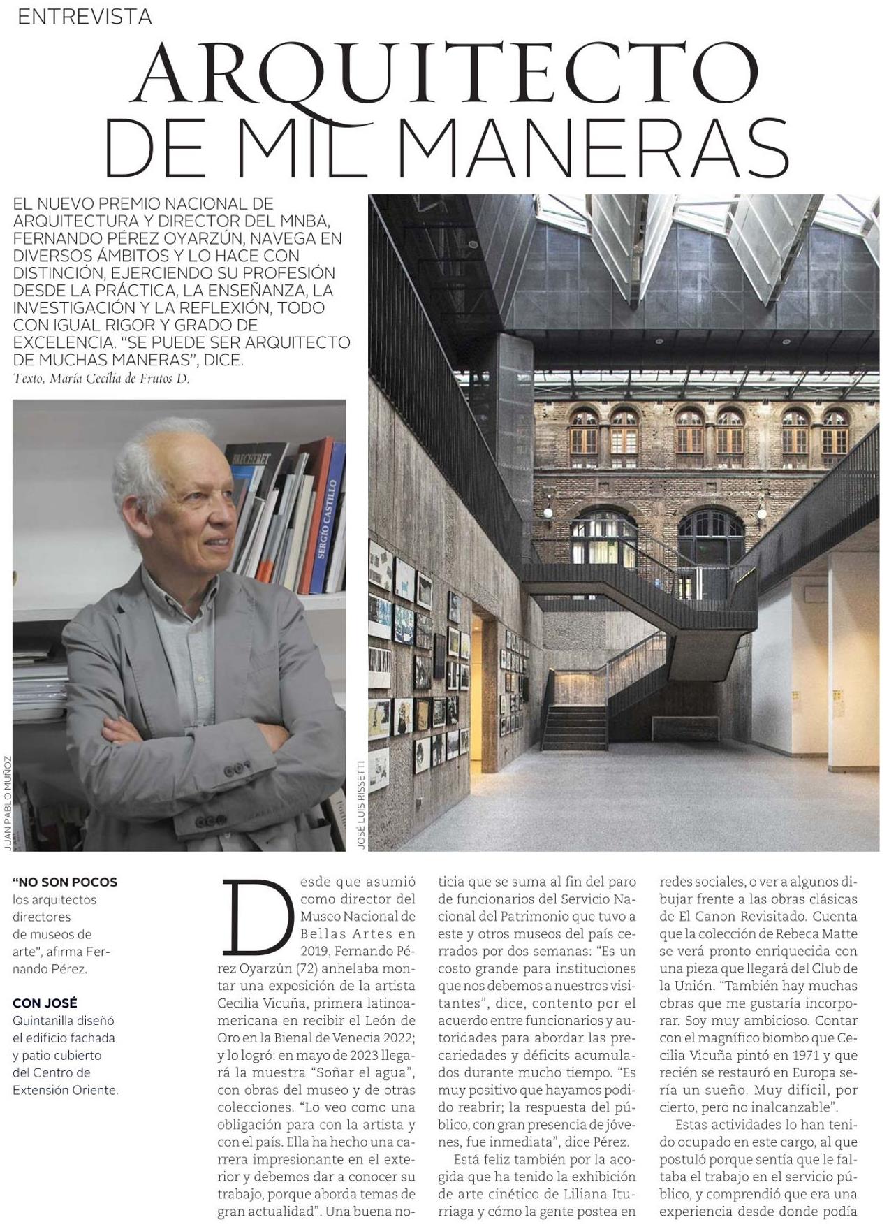Revista VD de El Mercurio destaca la trayectoria y la obra del arquitecto Fernando Pérez, nuevo Premio Nacional de Arquitectura y director del Museo Nacional de Bellas Artes.