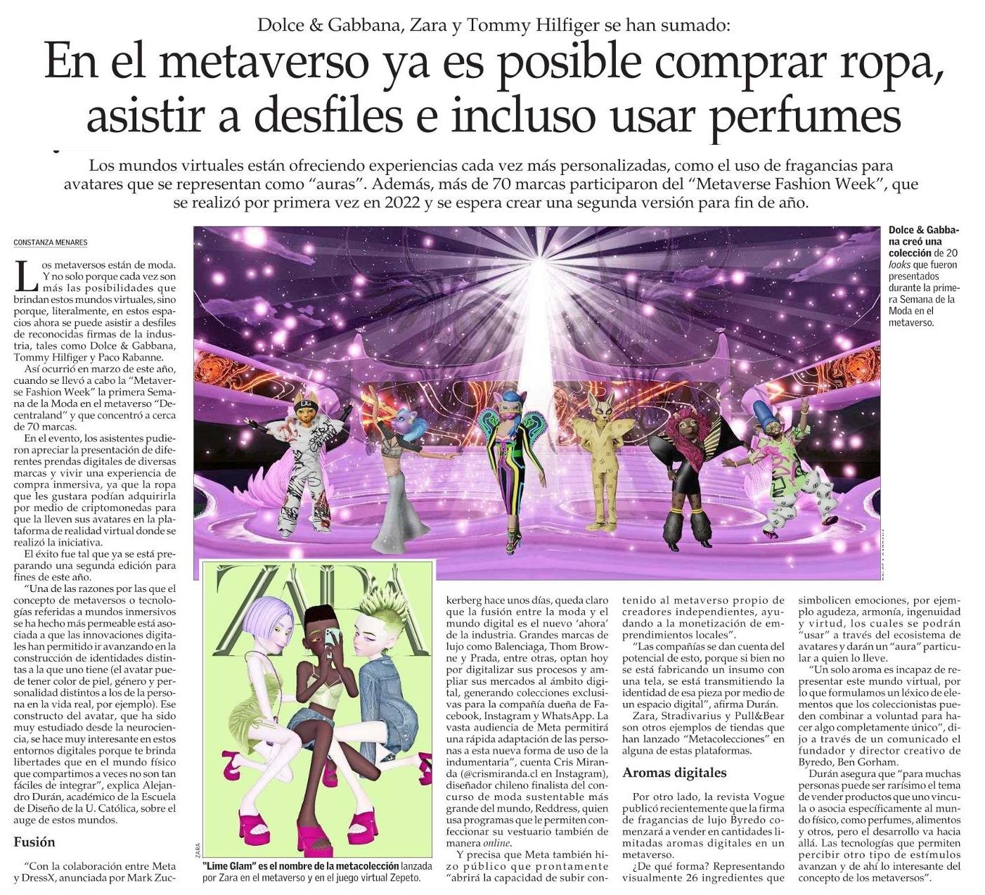 El Mercurio destaca que ya es posible comprar ropa, asistir a desfiles e incluso usar perfumes en el metaverso. Más de 70 marcas participaron del "Metaverse Fashion Week", que se realizó por primera vez en 2022. Habla el académico de la Escuela de Diseño, Alejandro Durán.