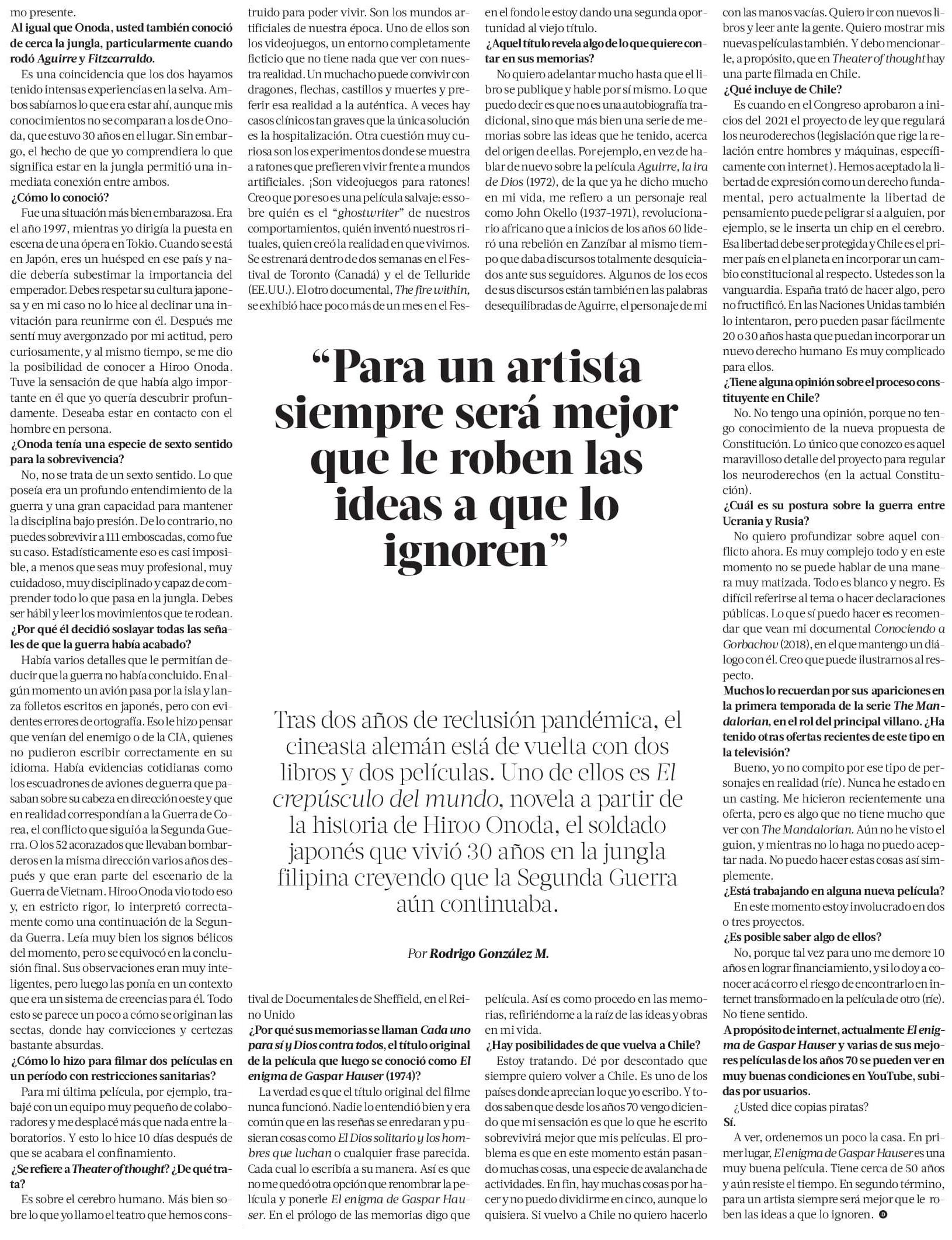 La Tercera entrevista al cineasta alemán Werner Herzog, sobre sus más recientes trabajos, dos libros y dos películas, y sus proyectos. Se menciona su visita a Chile, en diciembre de 2018, en el marco del programa La Ciudad y las Palabras, cuando dio una charla en el Campus Lo Contador.