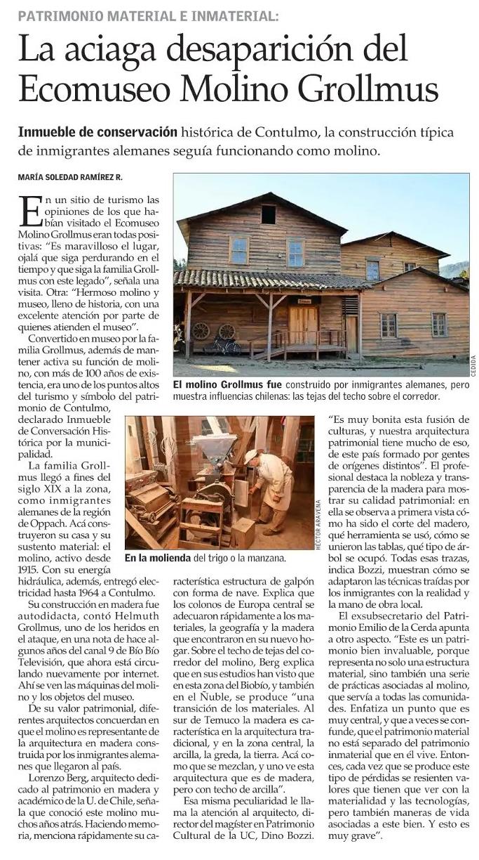 PRENSA I La aciaga desaparición del Ecomuseo Molino Grollmus Detalles 01 Septiembre 2022 Visto: 306 Tweet El Mercurio destaca la pérdida de patrimonio material e inmaterial con la desaparición del museo Molino Grollmus en Contulmo. Habla el jefe del magíster en Patrimonio Cultural UC, Dino Bozzi. + Revisa nota completa aquí.