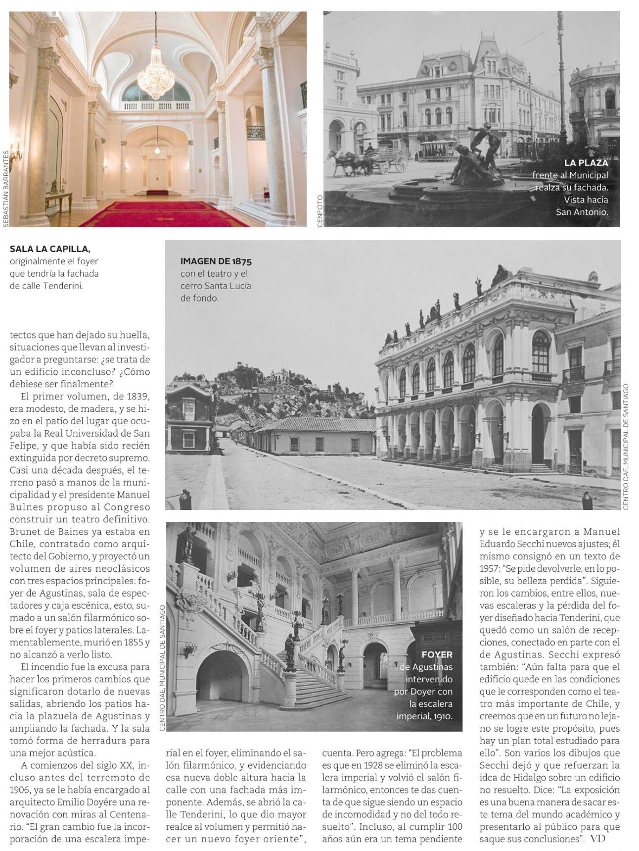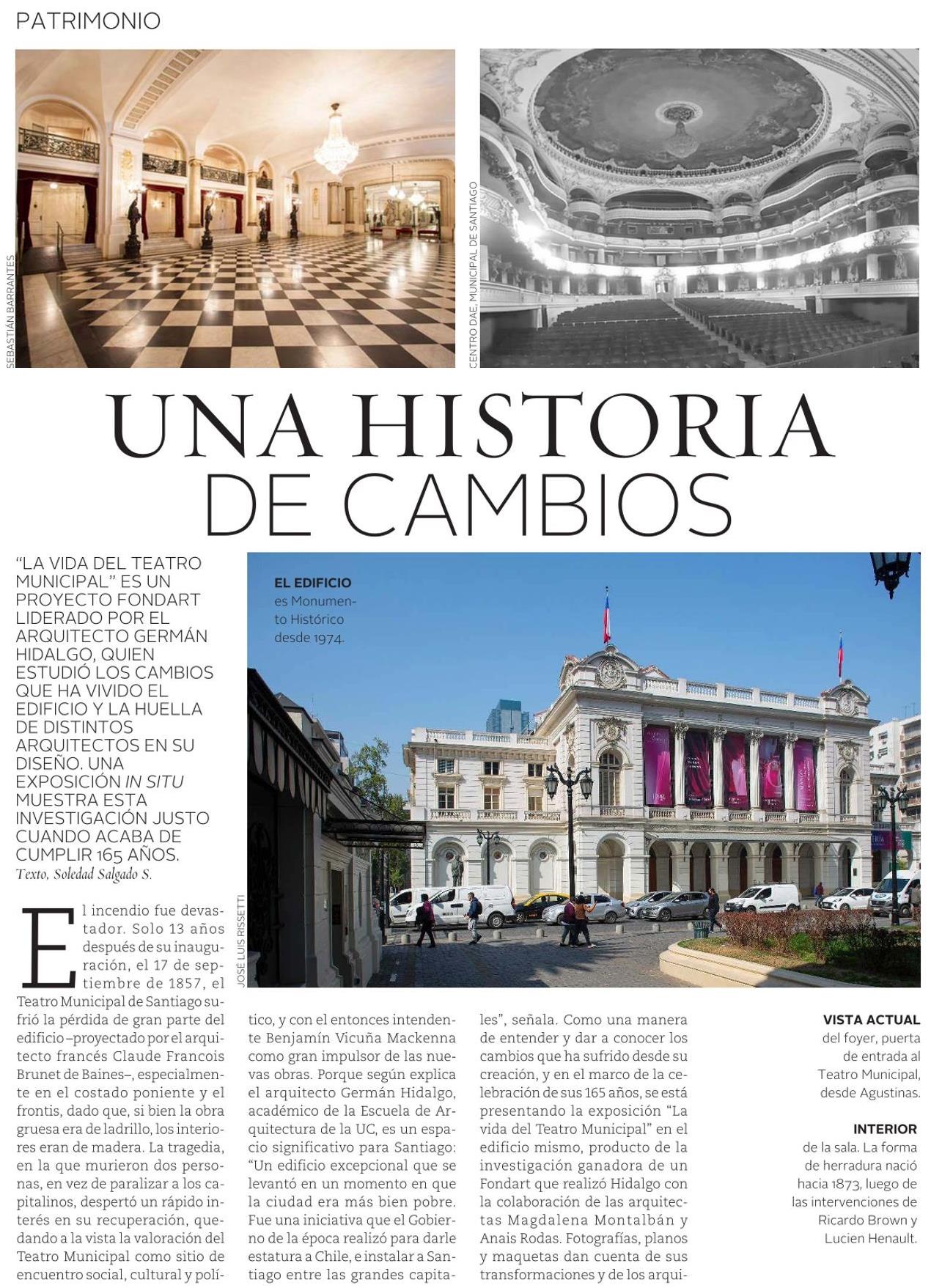 VD de El Mercurio destaca el proyecto Fondart "La vida del Teatro Municipal" liderado por el académico Germán Hidalgo, quien estudió los cambios que ha vivido el edificio y la huella de distintos arquitectos en su diseño.