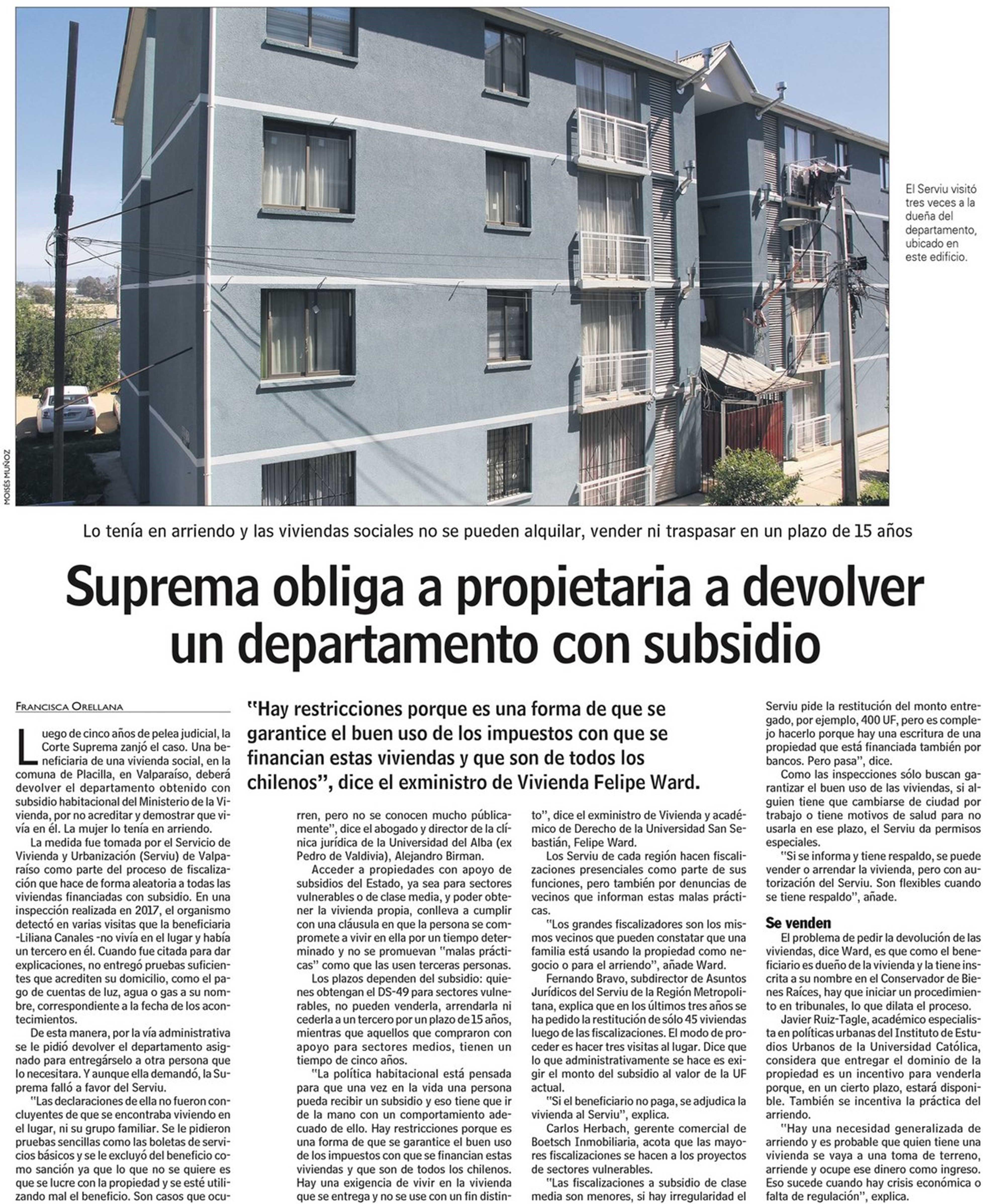 Las Últimas Noticias destaca que la Corte Suprema obliga a propietaria a devolver un departamento con subsidio. Lo tenía en arriendo y las viviendas sociales no se pueden alquilar, vender ni traspasar en un plazo de 15 años. Habla el académico Javier Ruiz-Tagle.