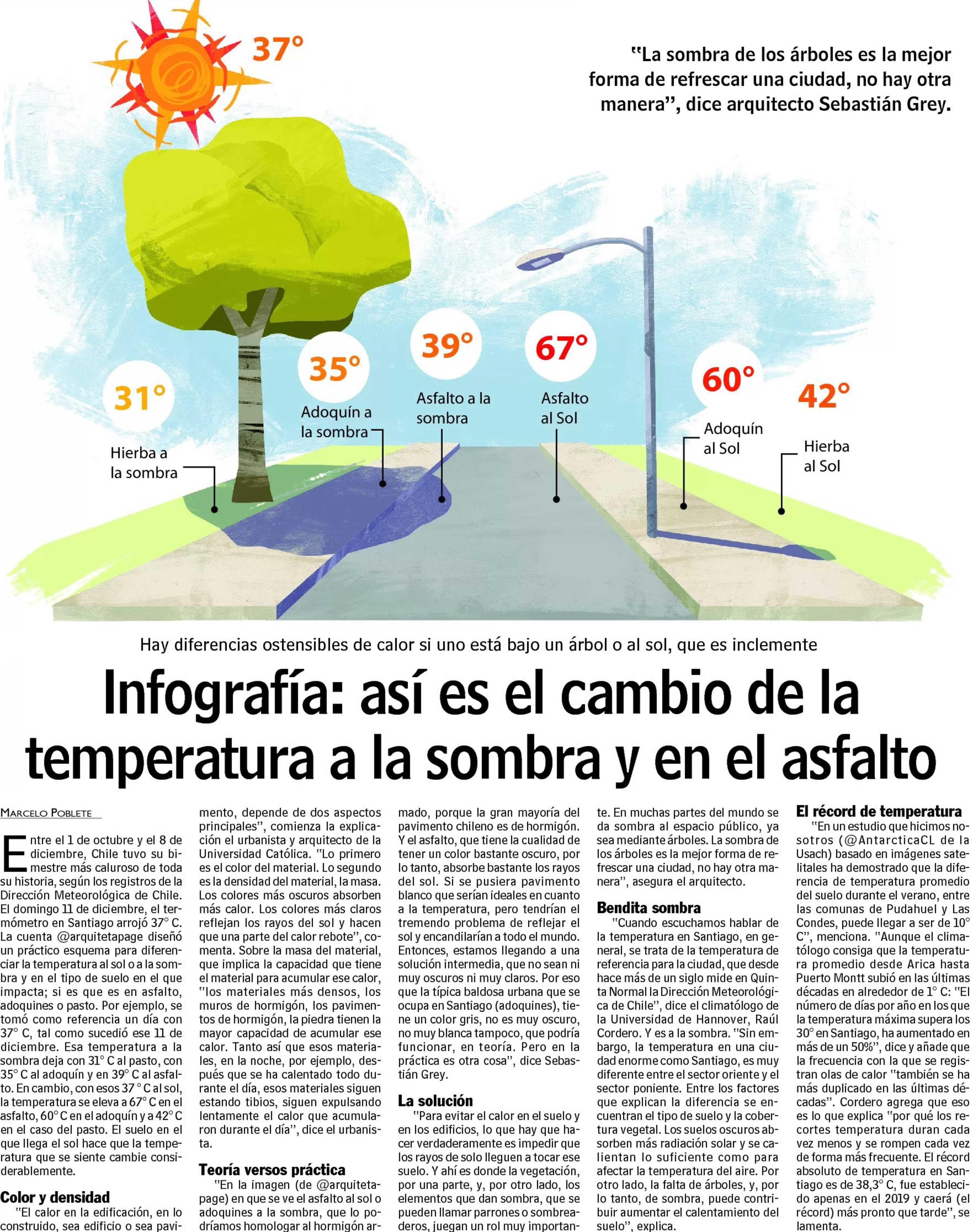 Las Últimas Noticias destaca el cambio de la temperatura dependiendo de si se está al sol o a la sombra y del tipo de suelo: asfalto, adoquines o pasto. Habla el académico Sebastián Gray.