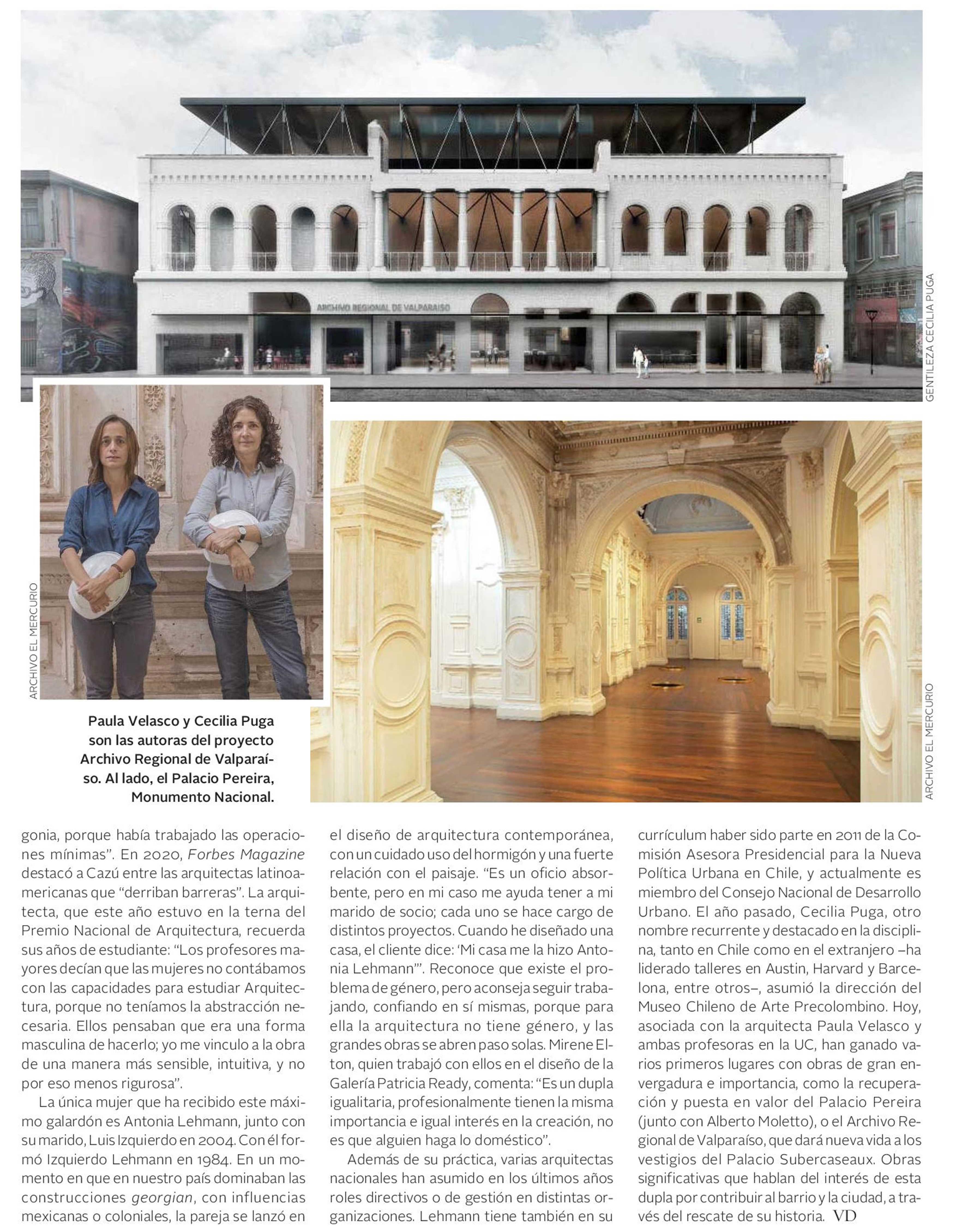 VD de El Mercurio destaca a las profesionales chilenas que han dejado huellas en la arquitectura, y que en los últimos años están siendo visibilizadas. Se menciona que Cecilia Puga, directora del Museo Chileno de Arte Precolombino, asociada con la arquitecta Paula Velasco, ambas profesoras en la UC, han ganado varios primeros lugares con obras de gran envergadura e importancia.