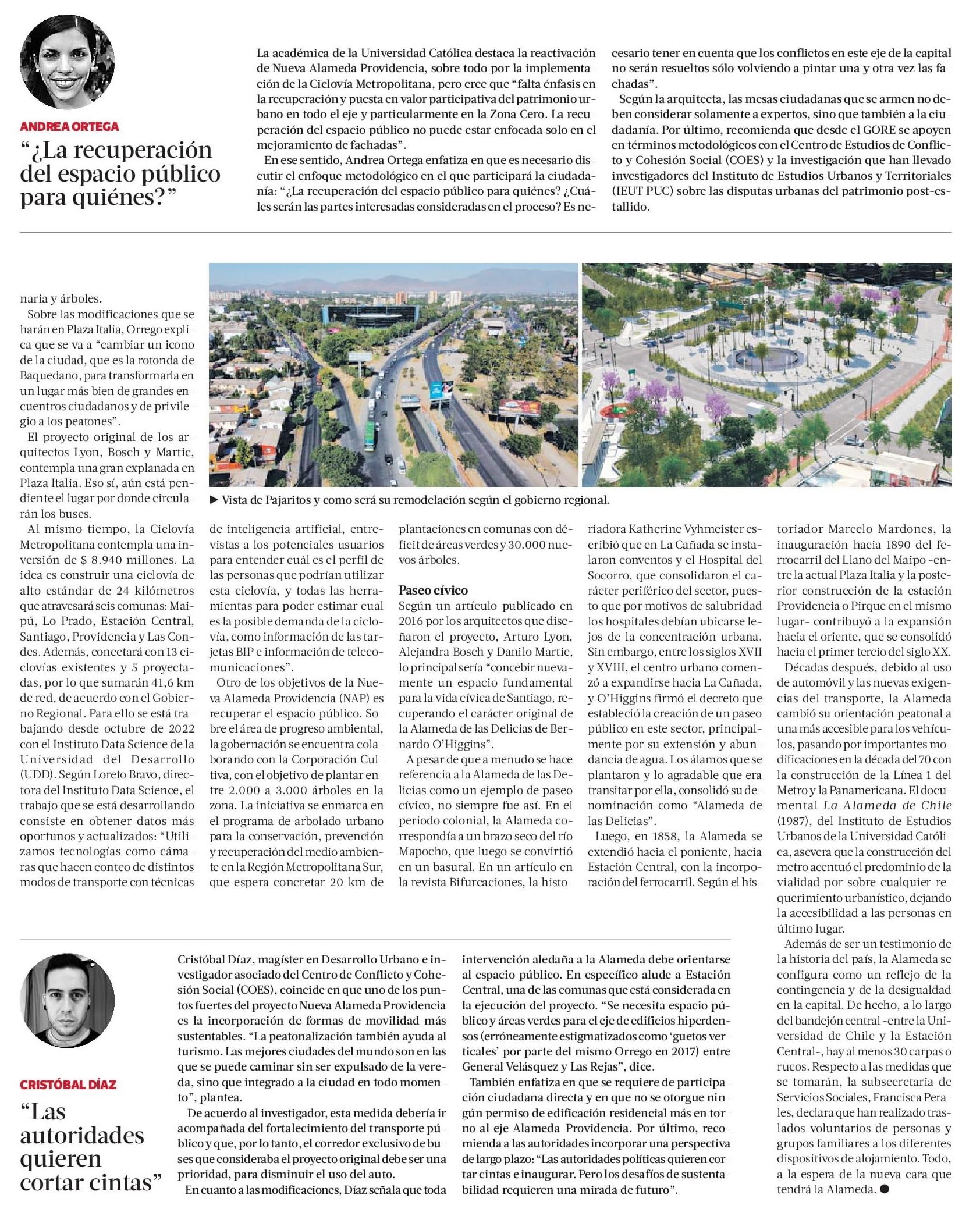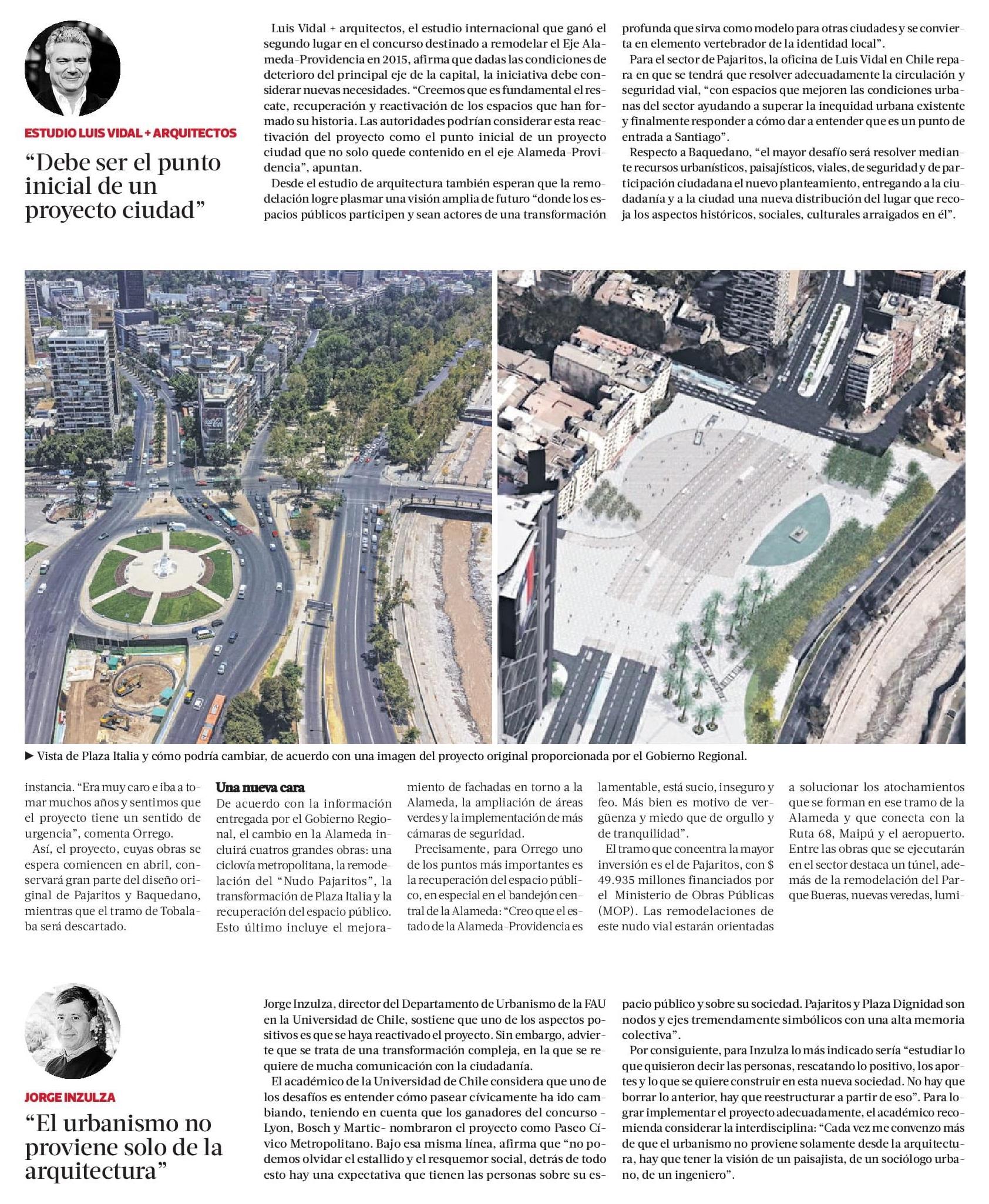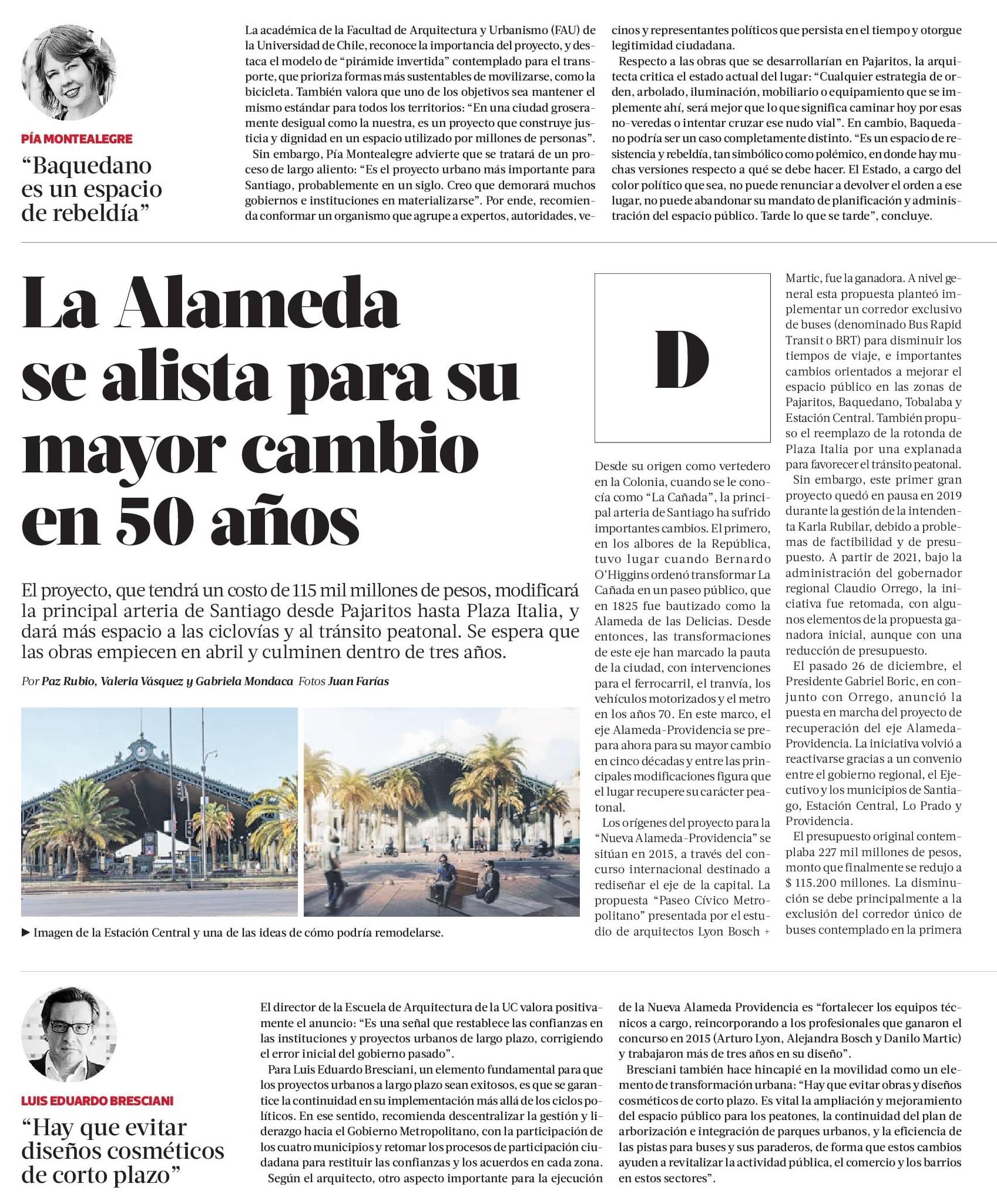La Tercera destaca que la Alameda se alista para su mayor cambio en 50 años. El proyecto modificará la principal arteria de Santiago desde Pajaritos hasta Plaza Italia, y dará más espacio a las ciclovías y al tránsito peatonal. Se espera que las obras empiecen en abril y culminen dentro de tres años. Habla Luis Eduardo Bresciani, director de la escuela, y la profesora Andrea Ortega.