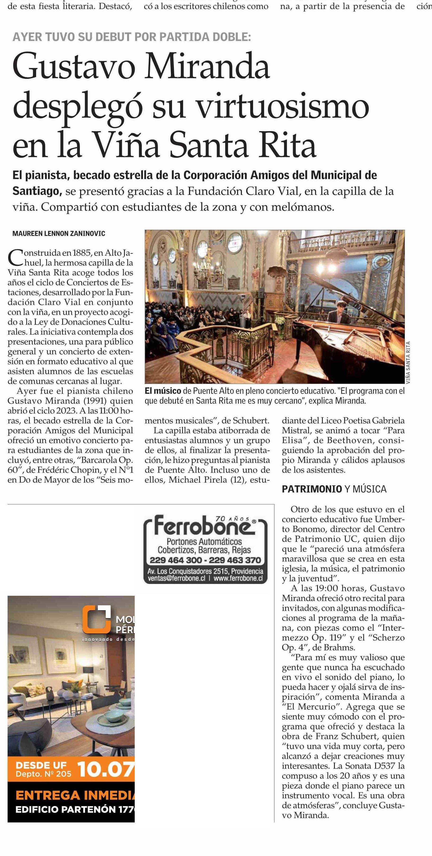 El Mercurio destaca que el pianista chileno Gustavo Miranda abrió el ciclo 2023 de Conciertos de Estaciones, desarrollado por la Fundación Claro Vial en conjunto con la Viña Santa Rita. El encuentro se desarrolló en Alto Jahuel, en la capilla de la Viña Santa Rita. Habla Umberto Bonomo, director del Centro del Patrimonio Cultural UC.